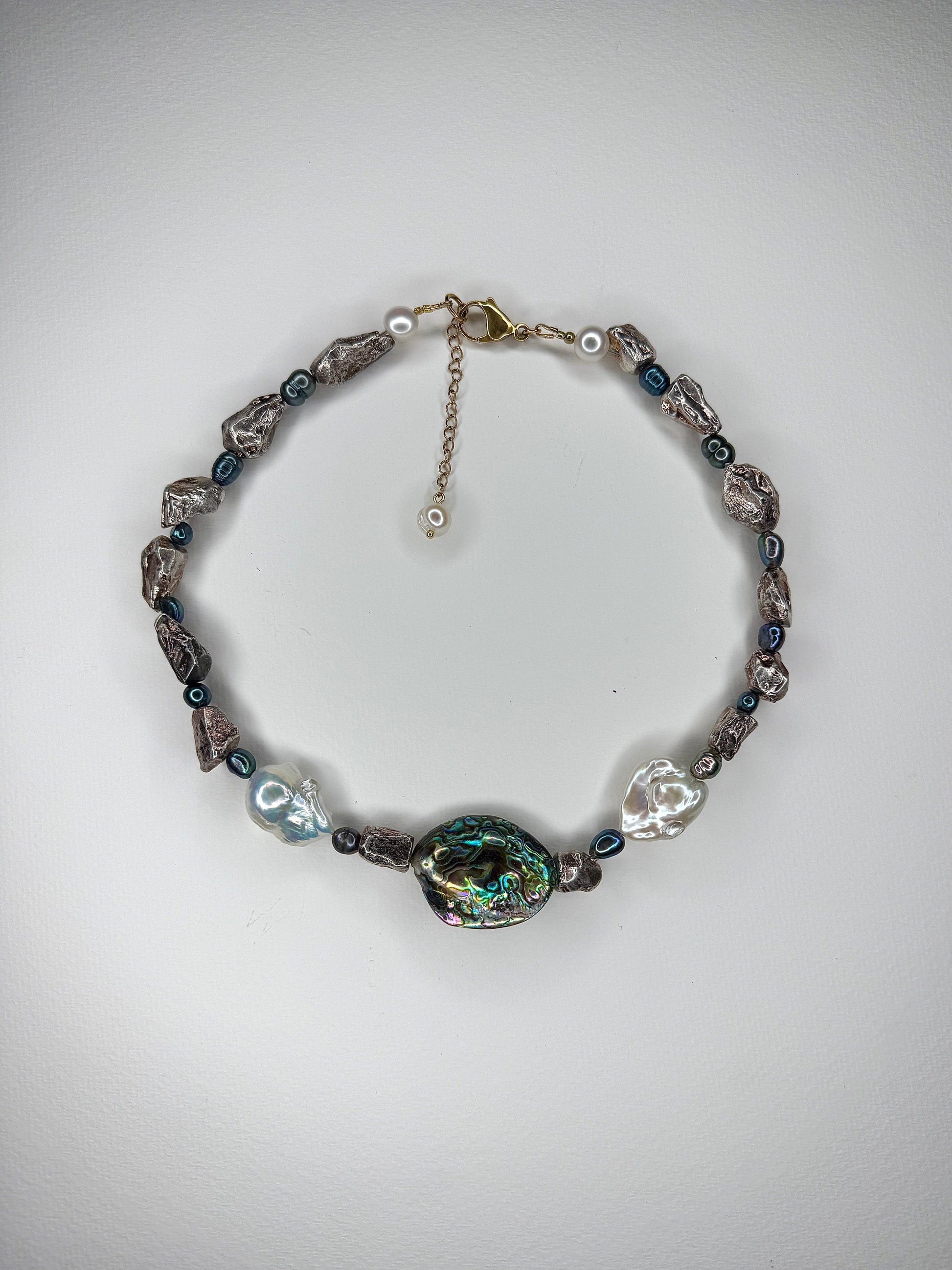 designed with abalone shell centerpiece, high luster baroque pearls, blue freshwater pearls and pirite
