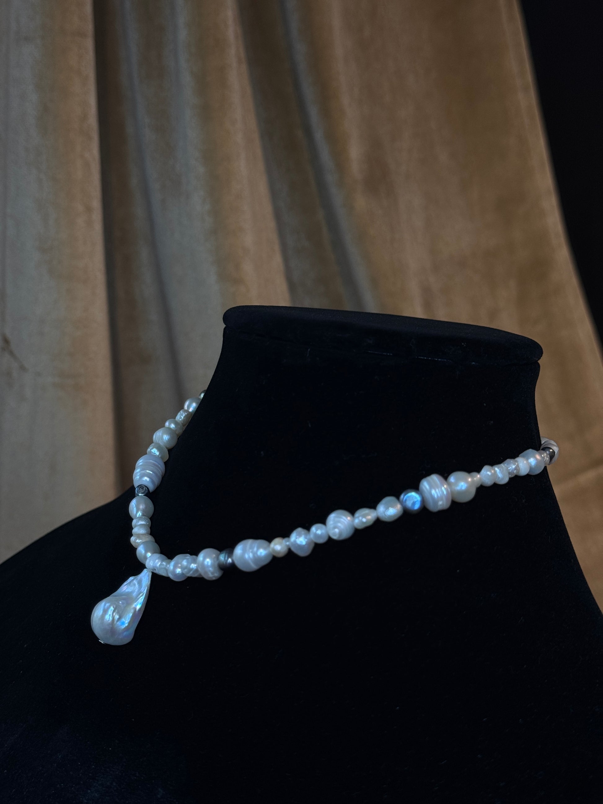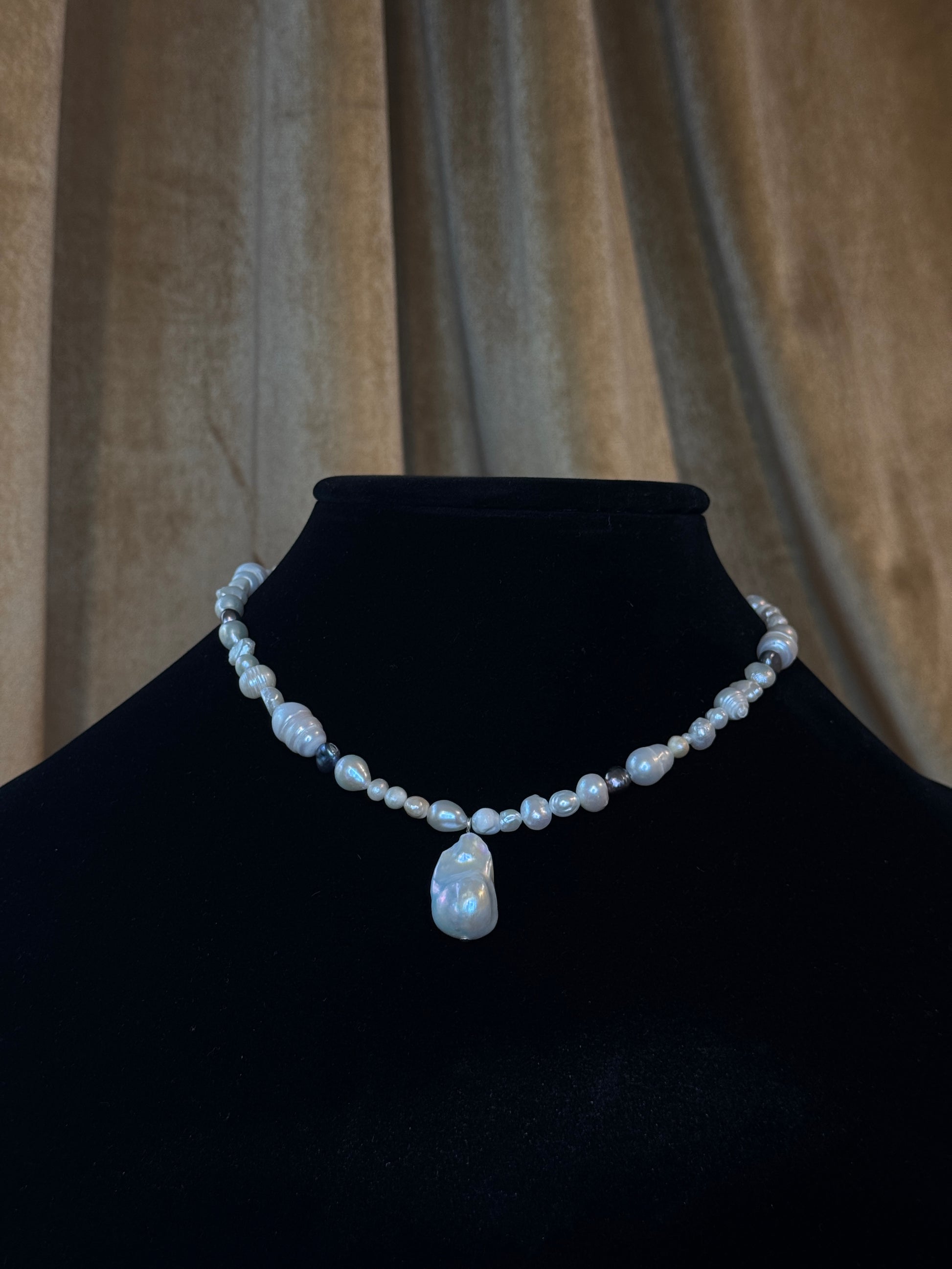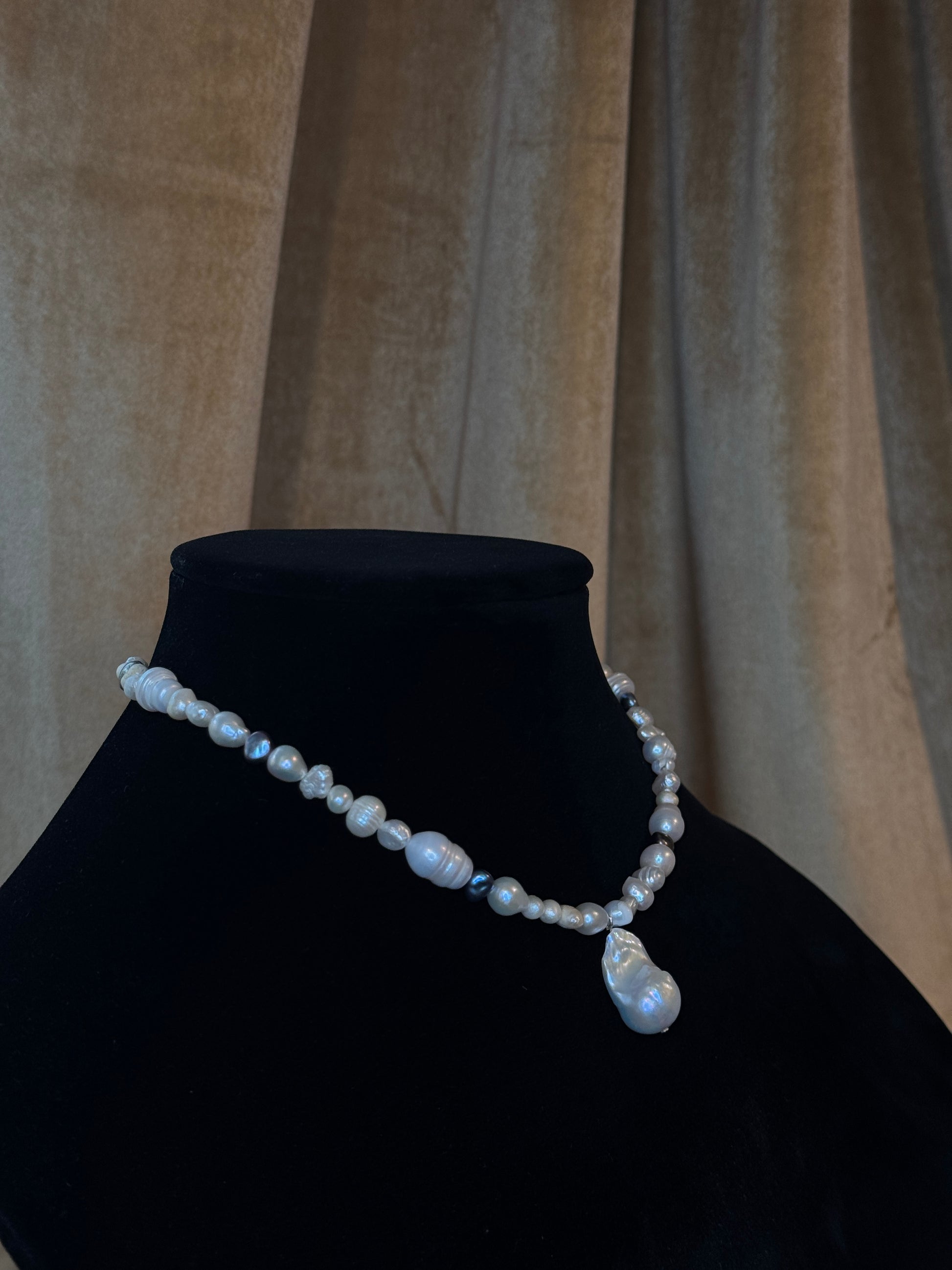 designed with irregular freshwater pearls, blue freshwater pearls, and a fireball baroque pendant.