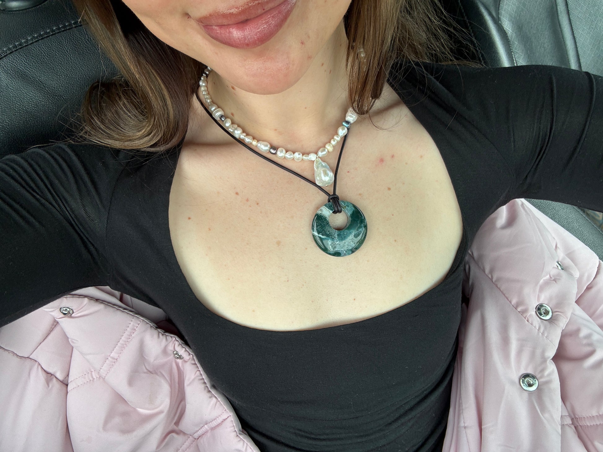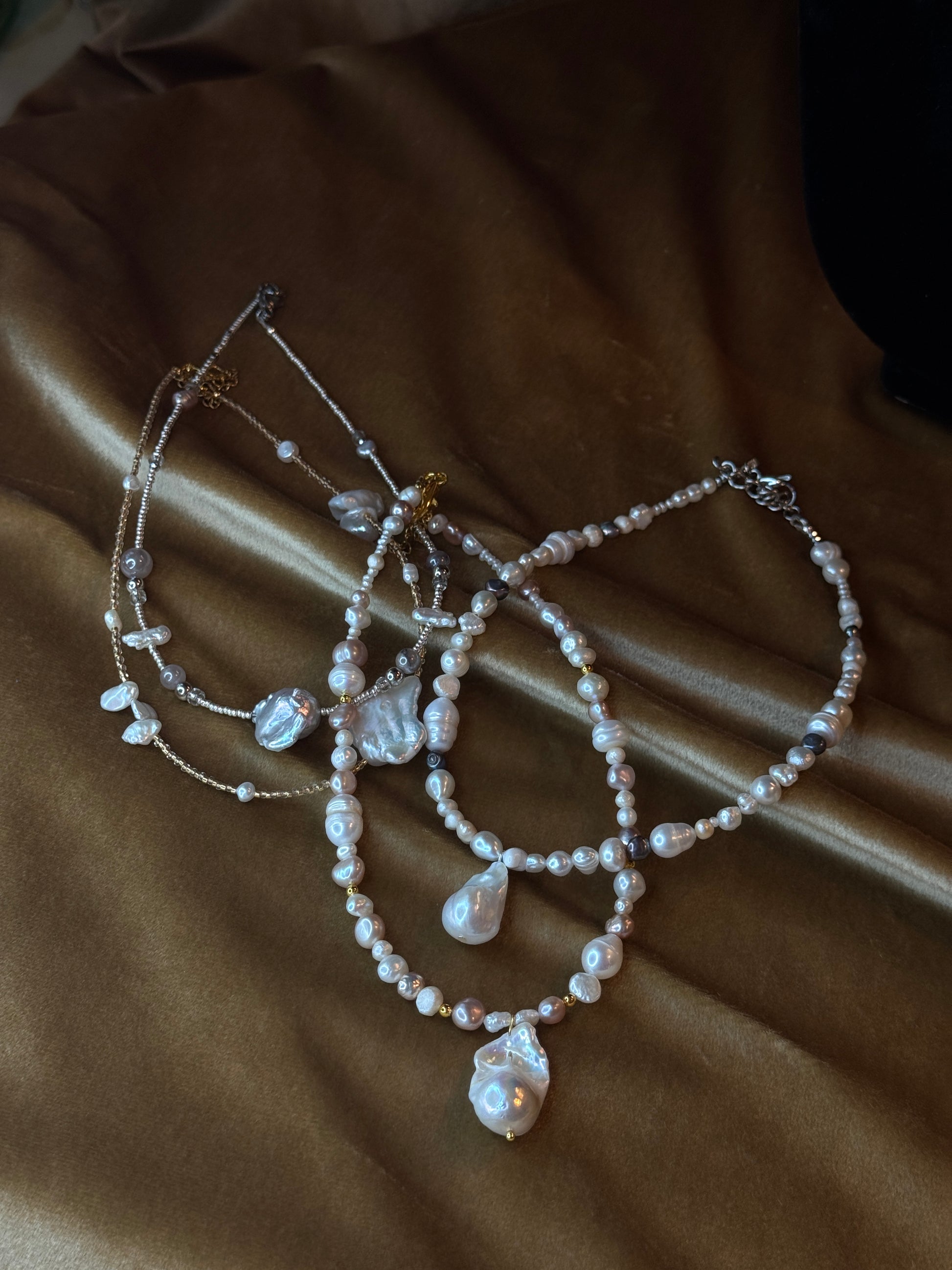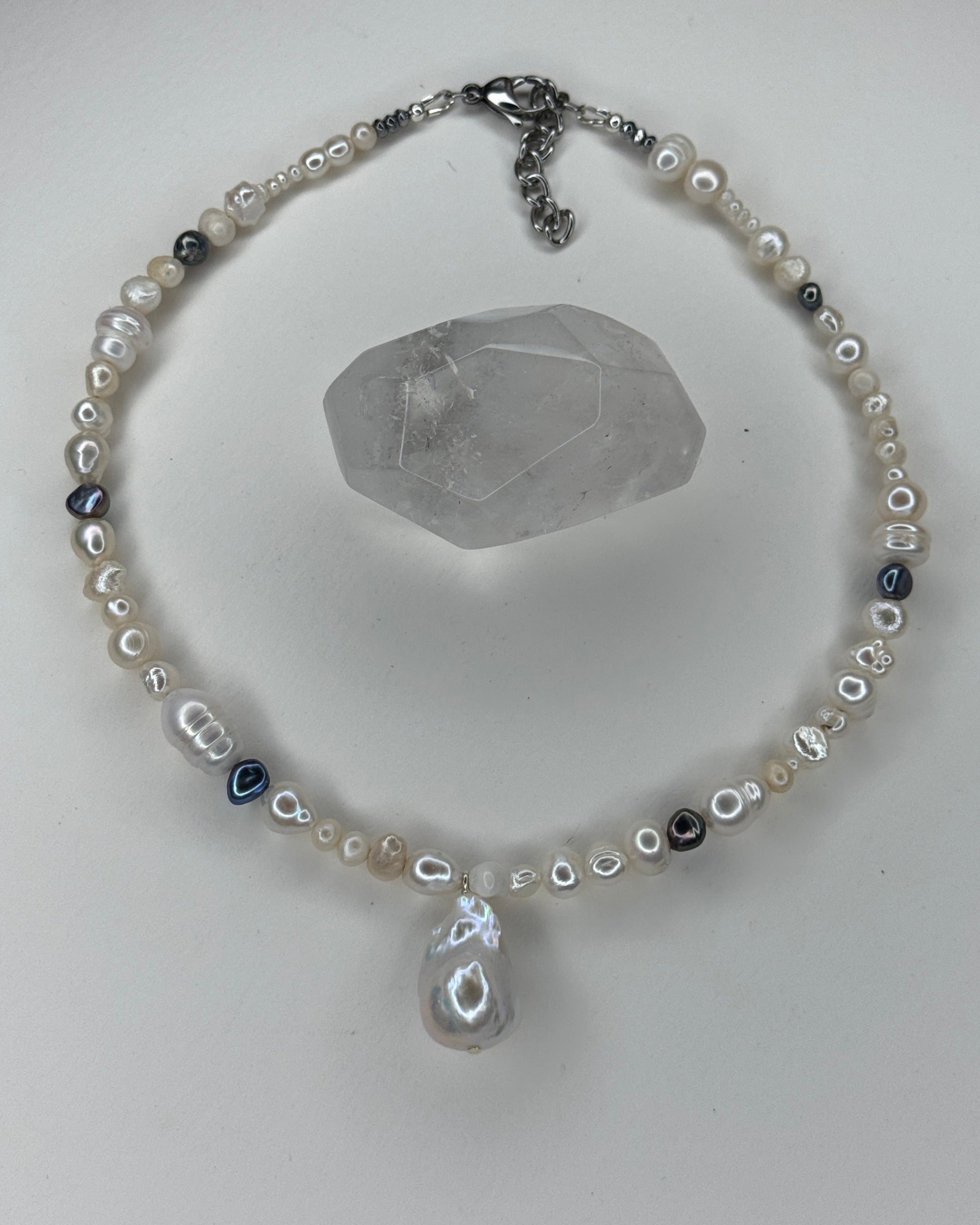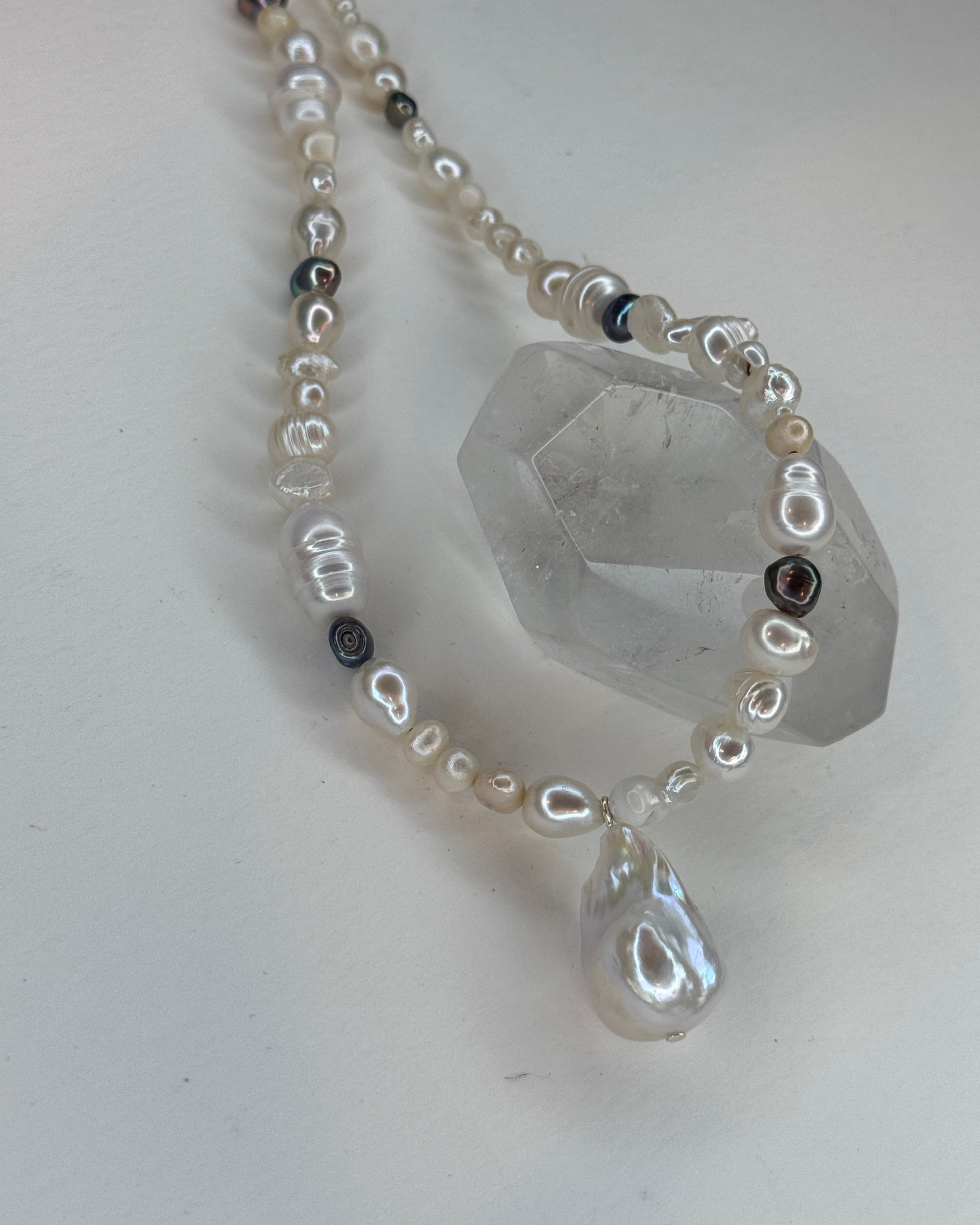 designed with irregular freshwater pearls, blue freshwater pearls, and a fireball baroque pendant.