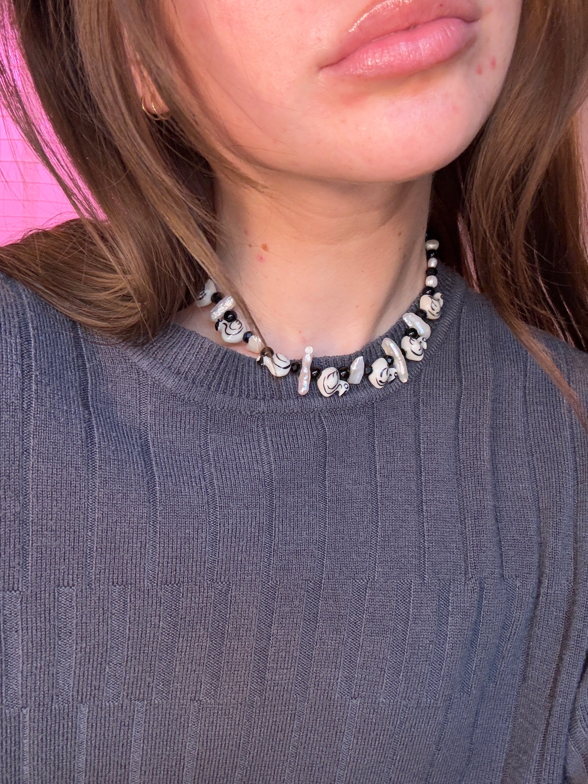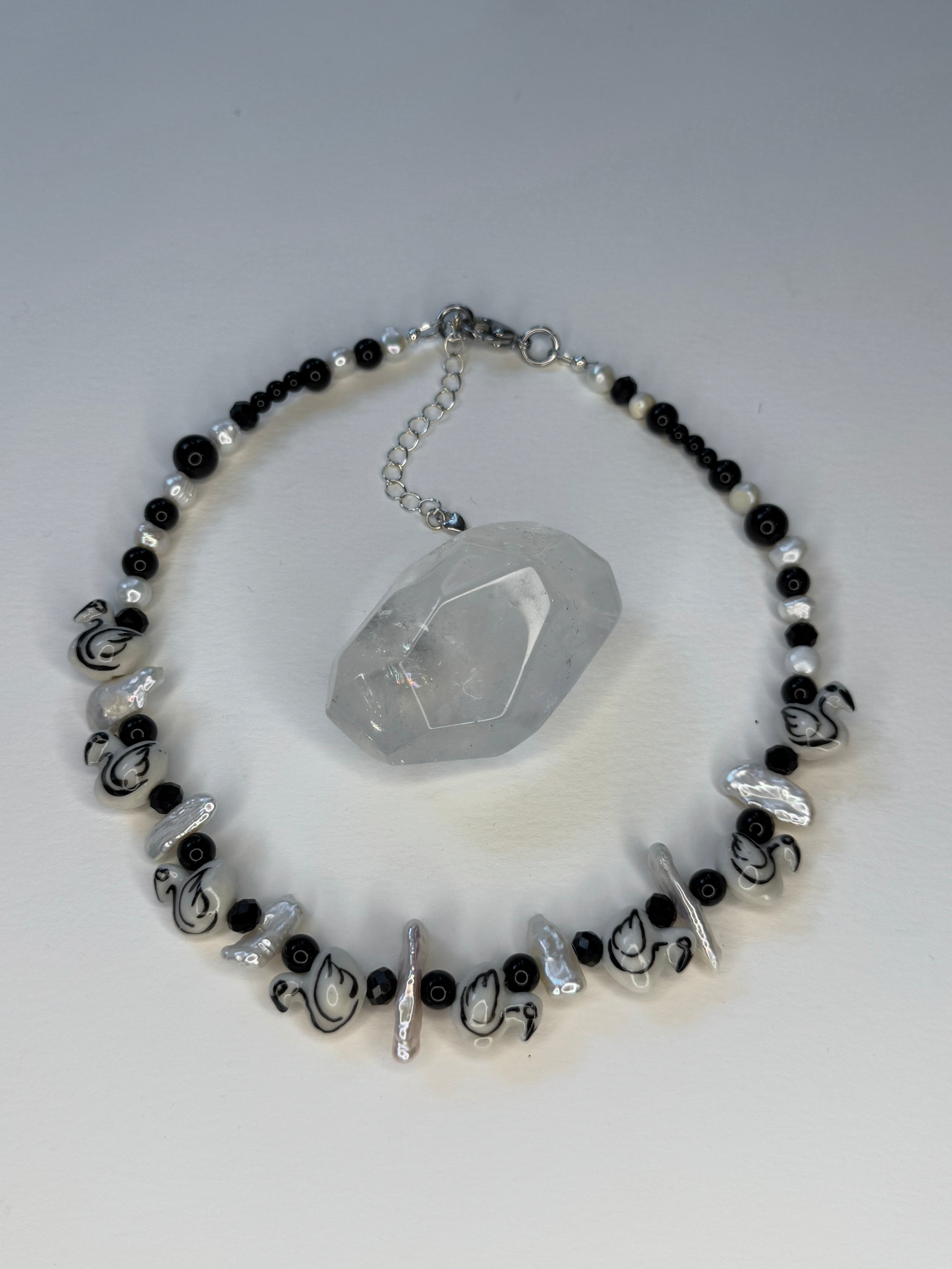 designed with rare baroque pearls, biwa, irregular freshwater pearls, round obsidian and glass beads, and adorable ceramic swan beads.