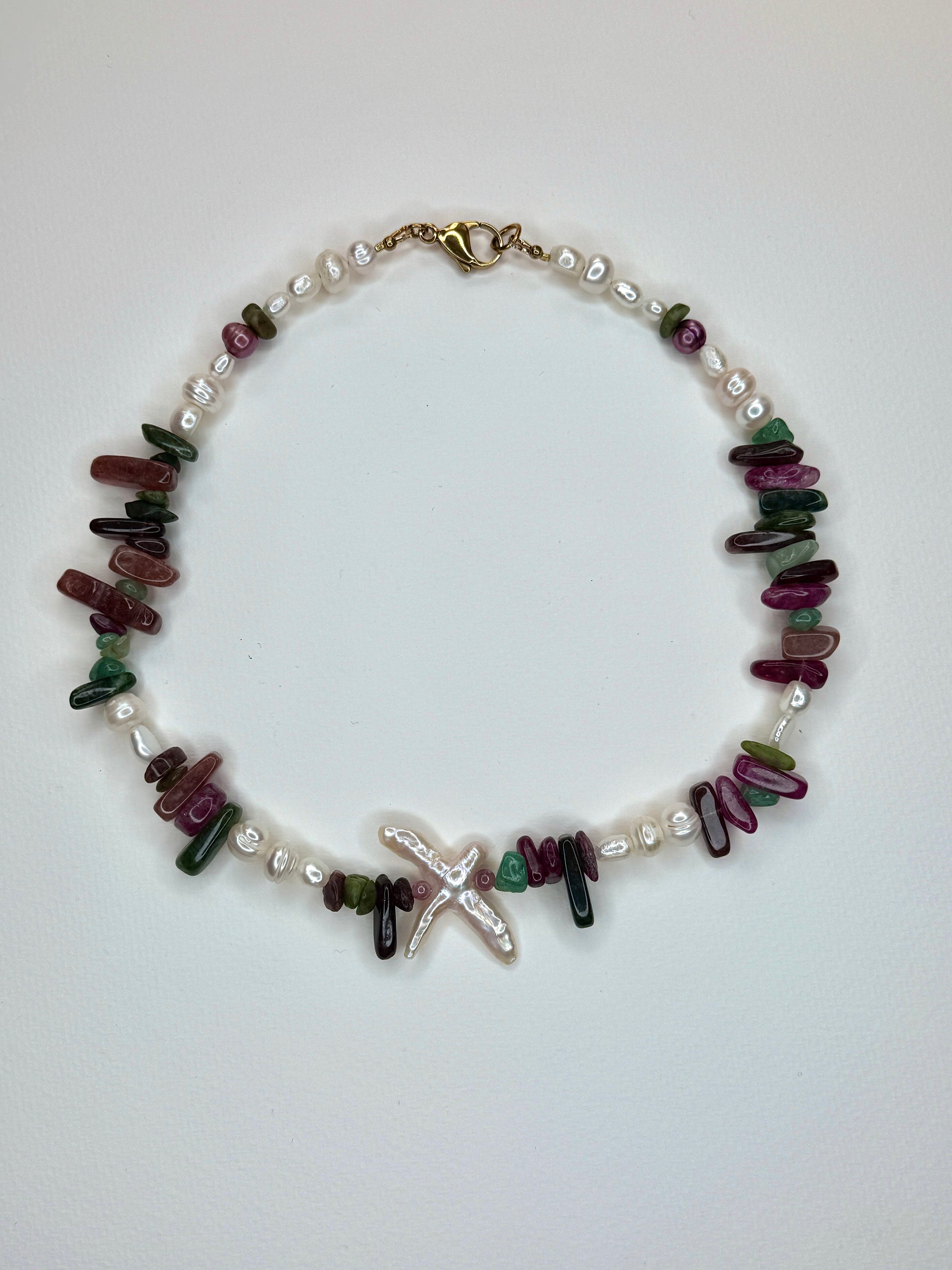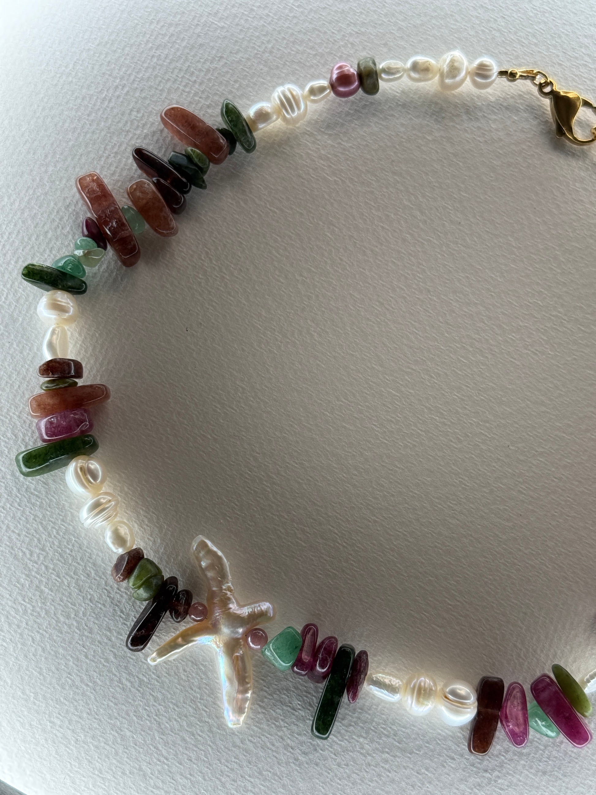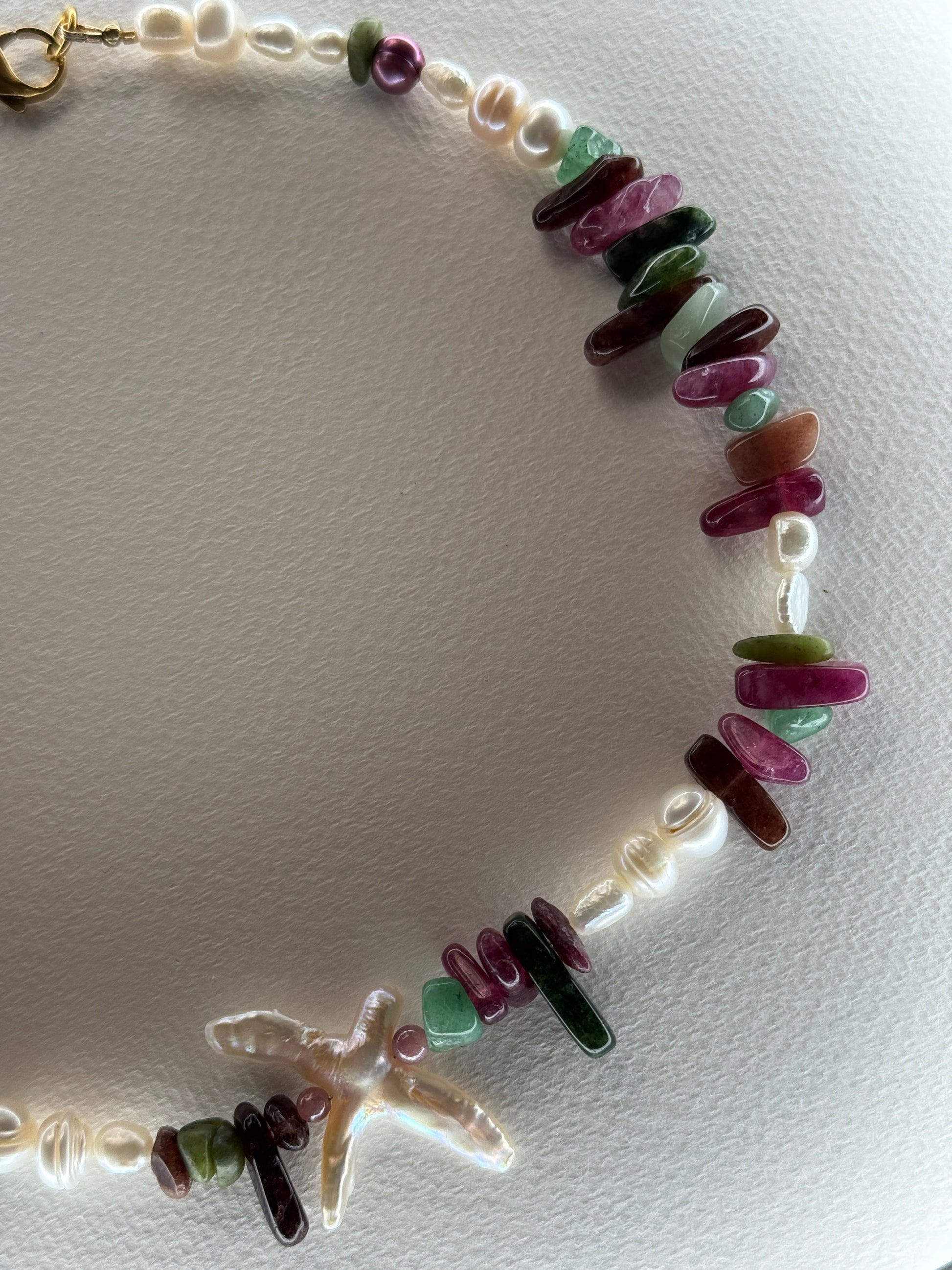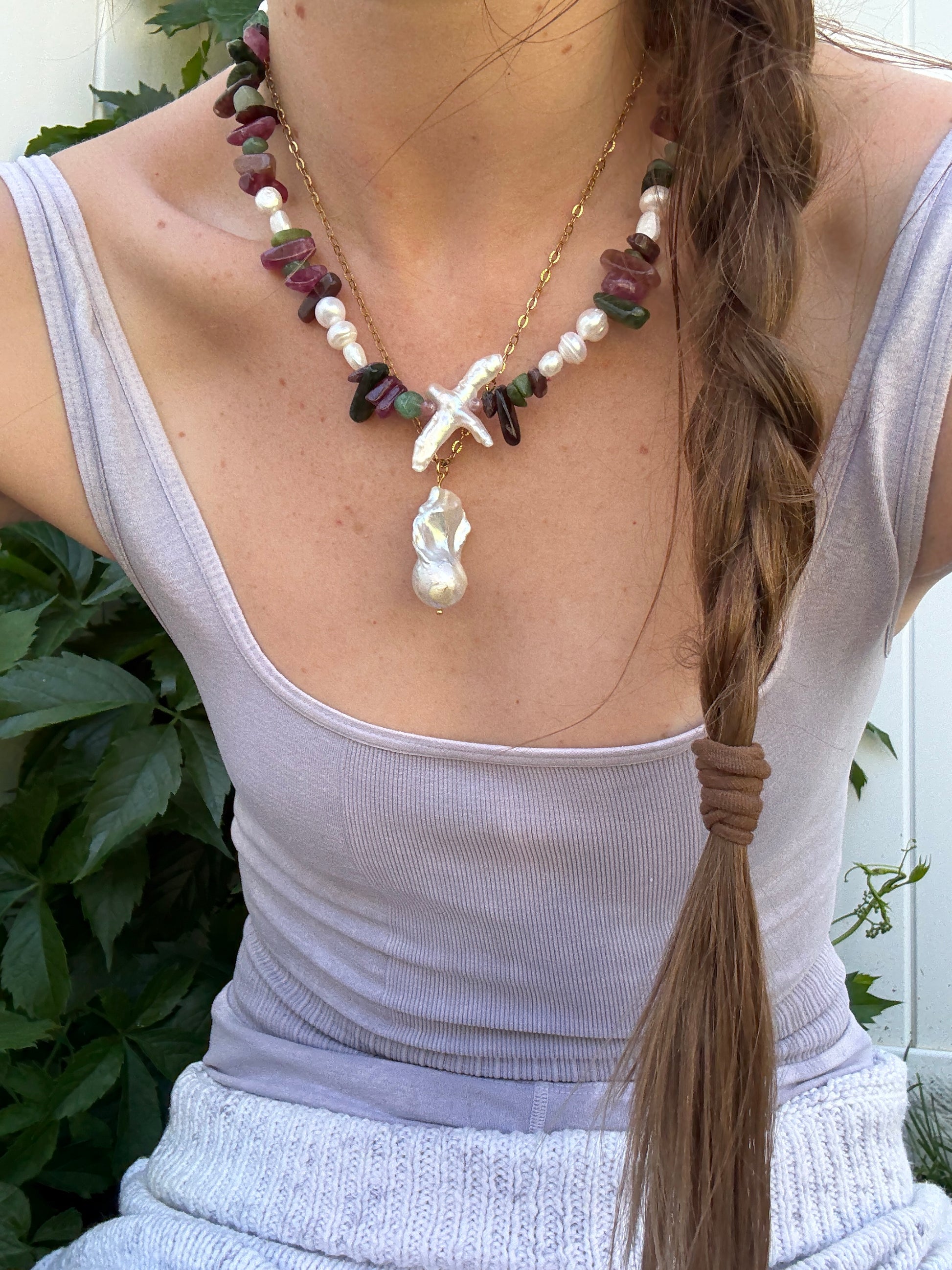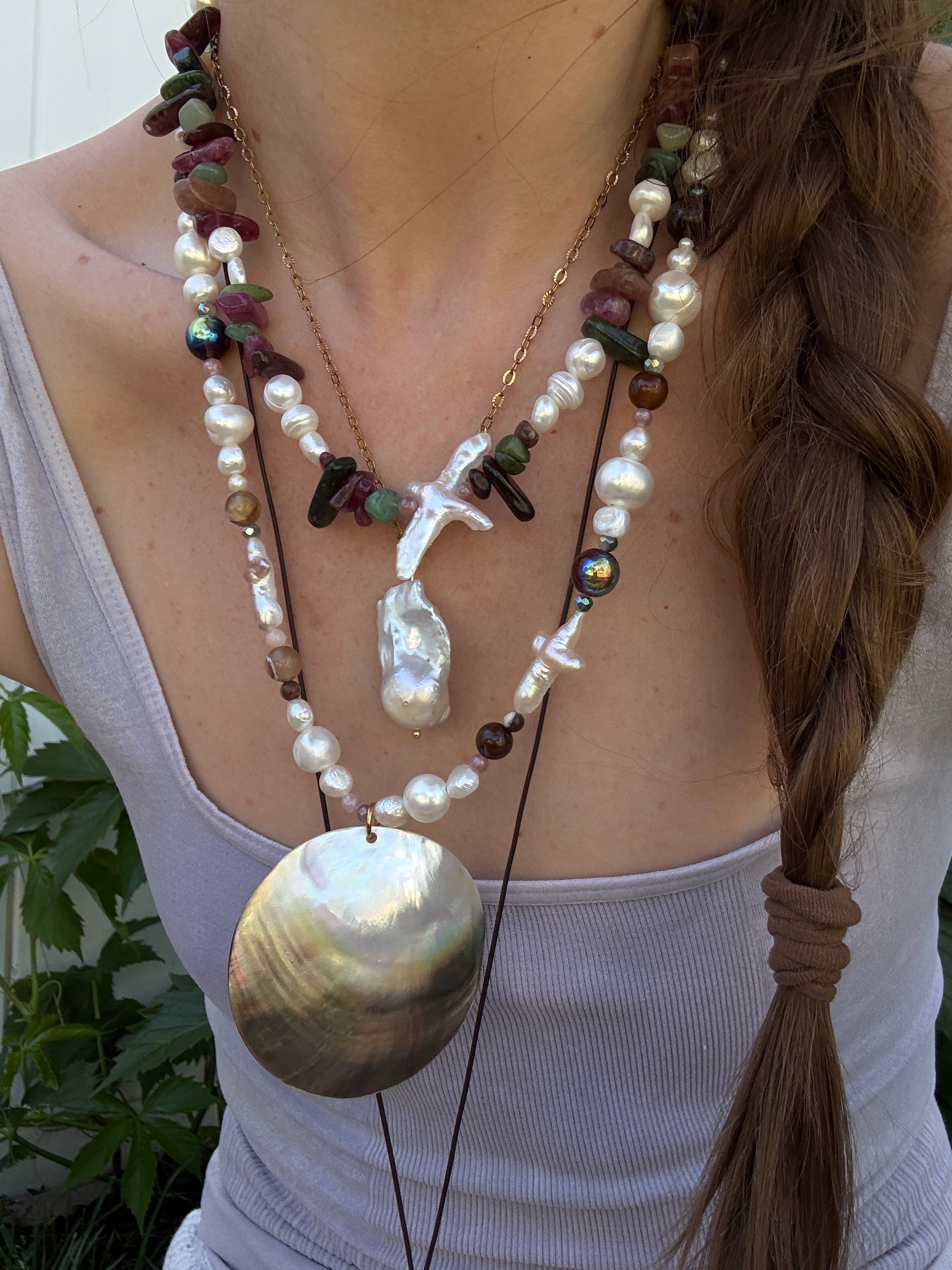 designed with high luster irregular baroque pearls, biwa / stick pearls, cross pearls, freshwater pearls, tourmaline and aquamarine