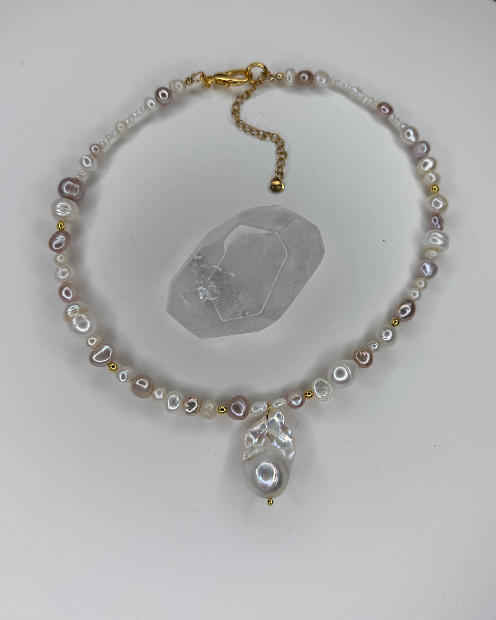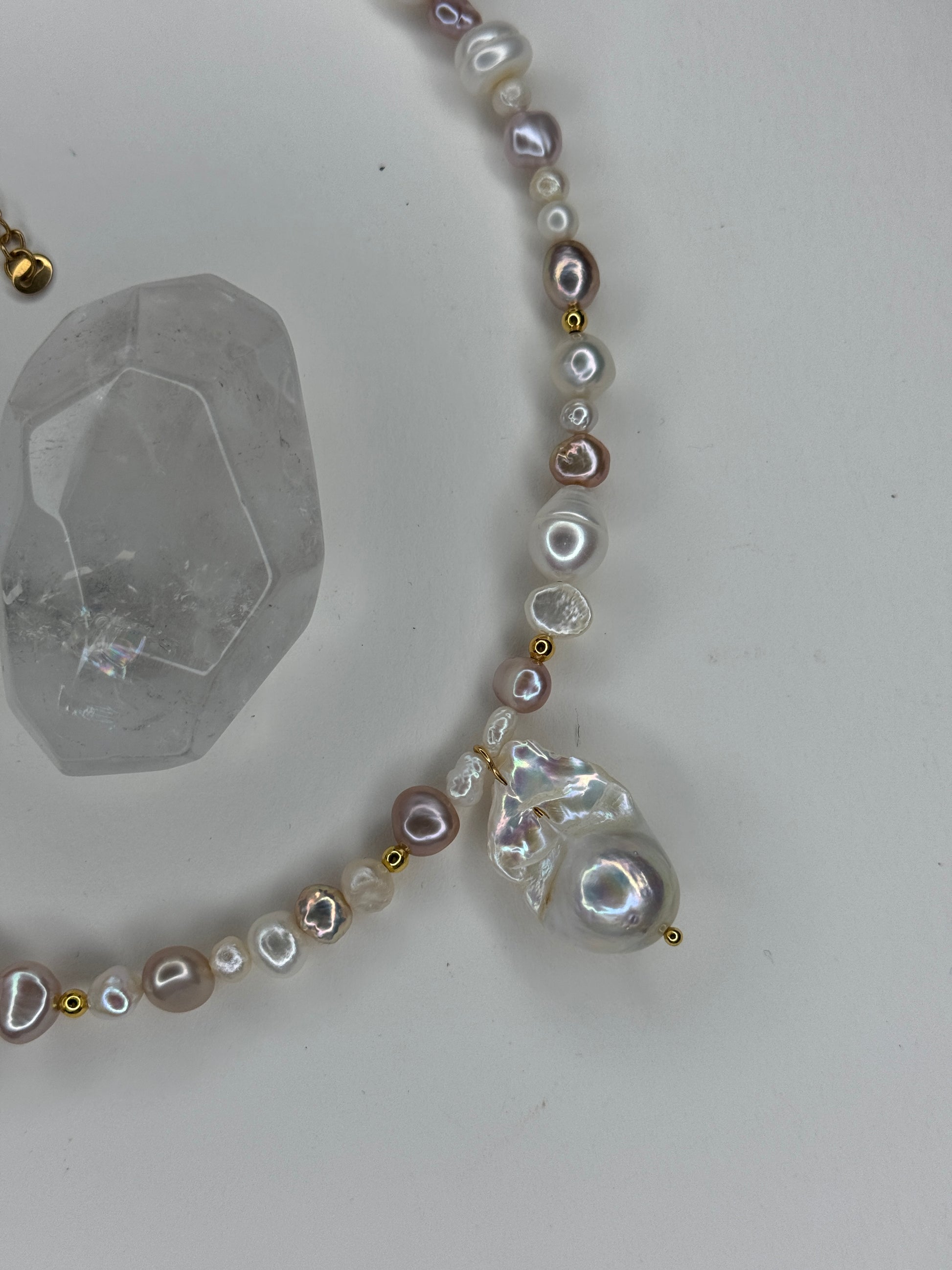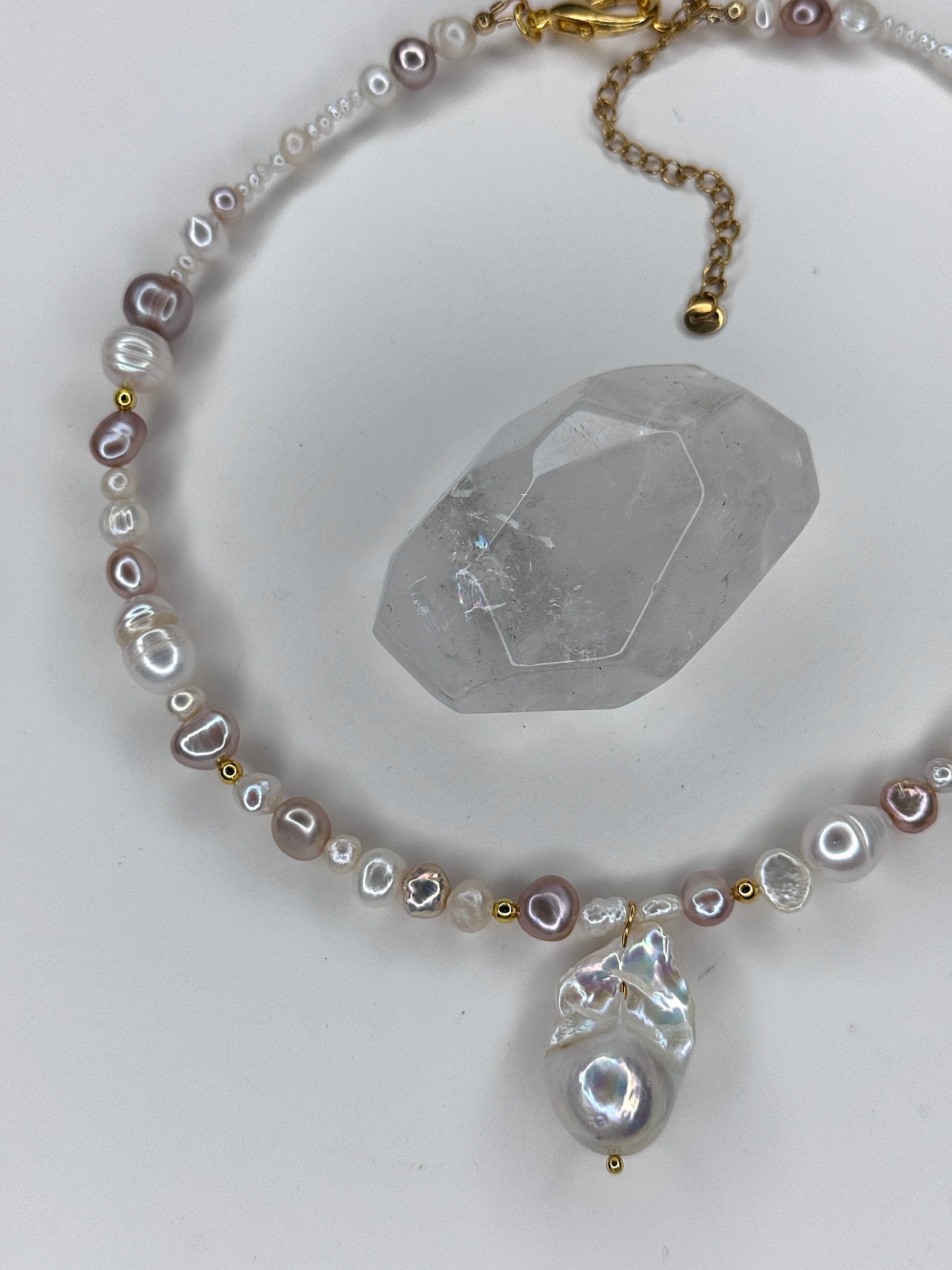 designed with high luster irregular freshwater pearls, pink freshwater pearls, and a fireball baroque pendant.