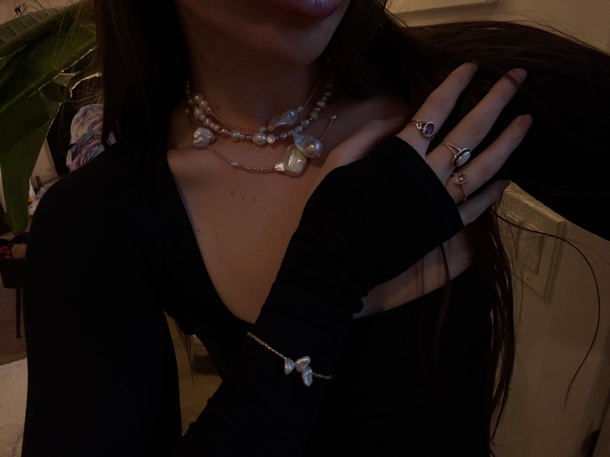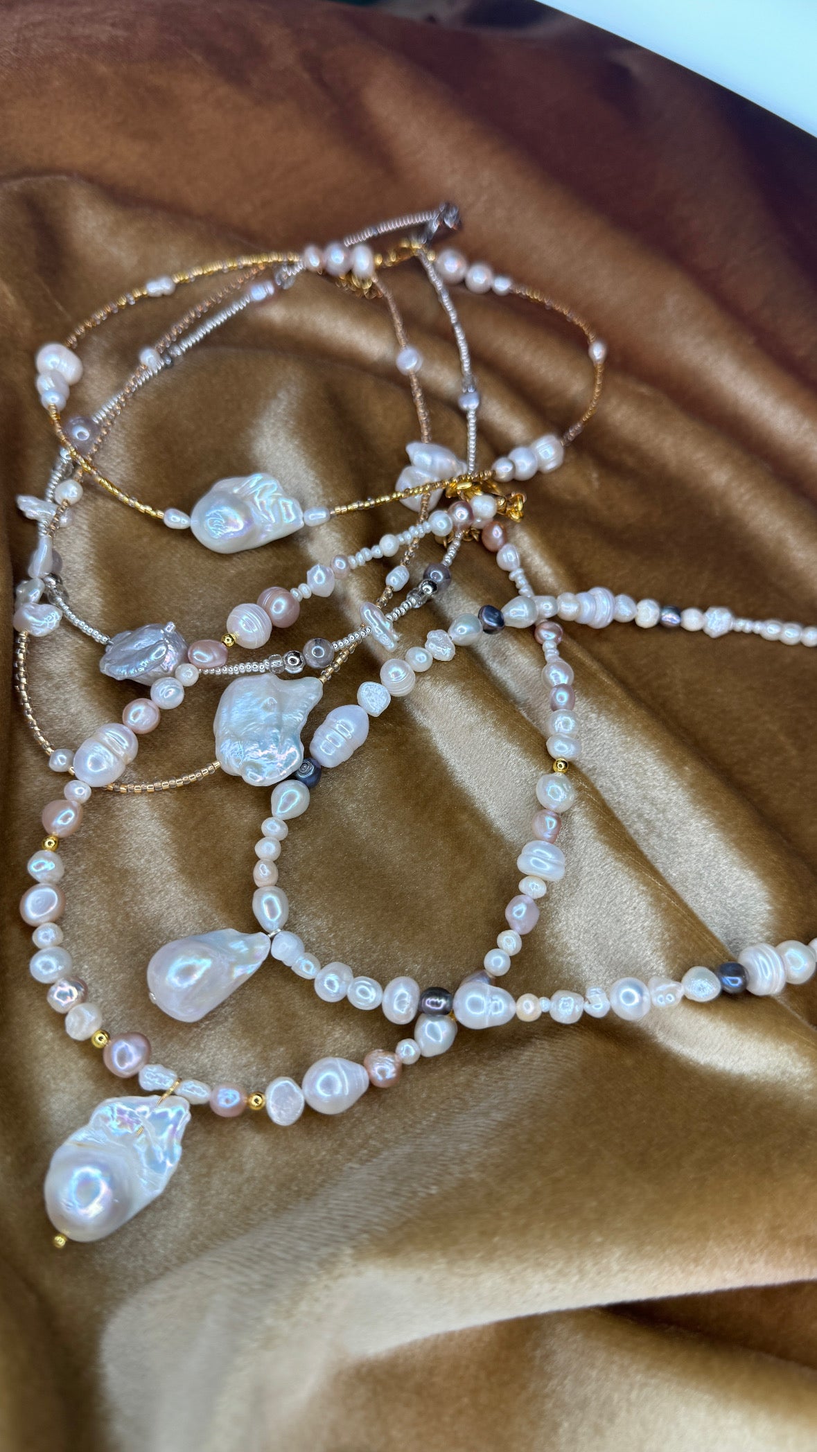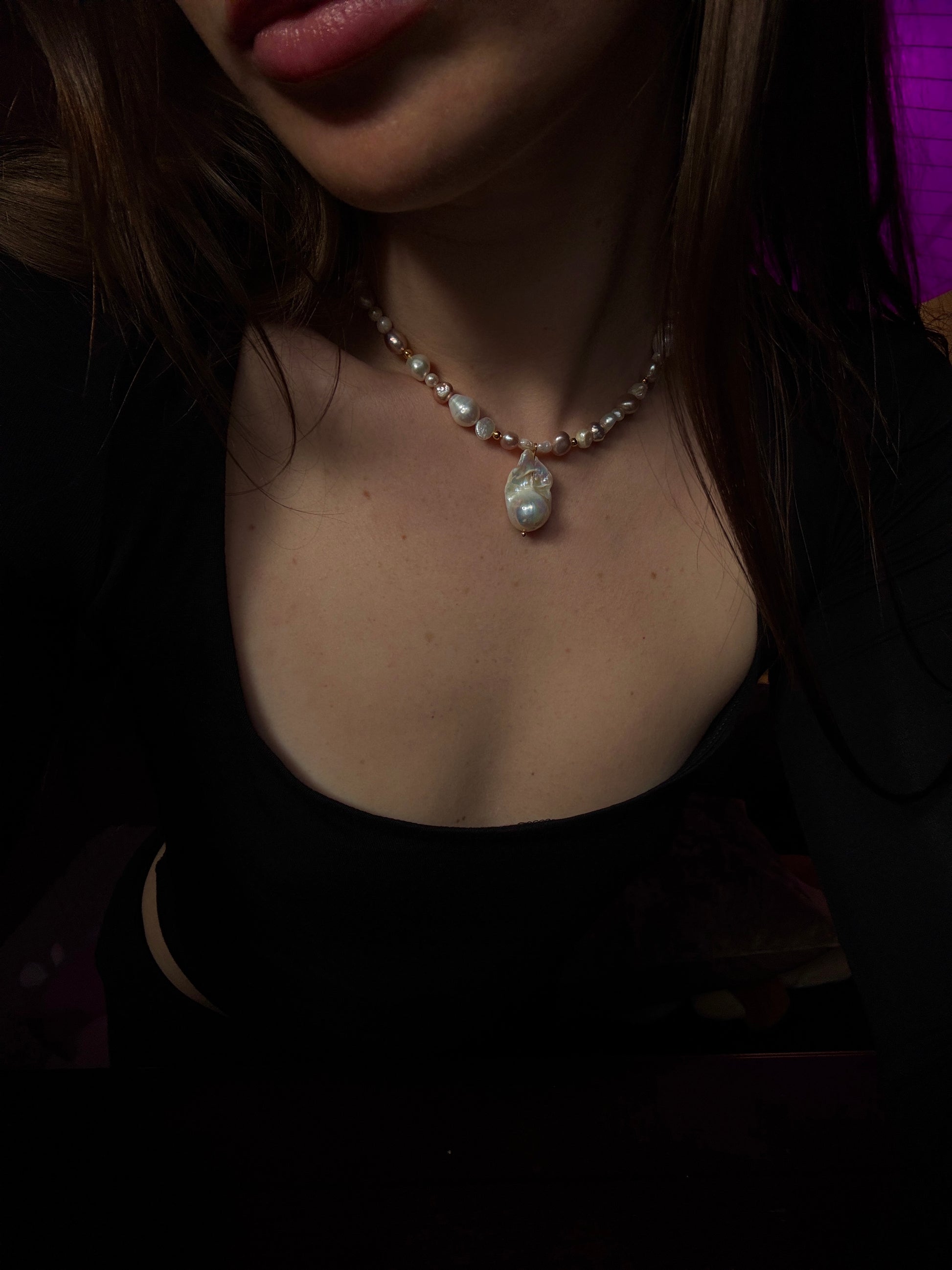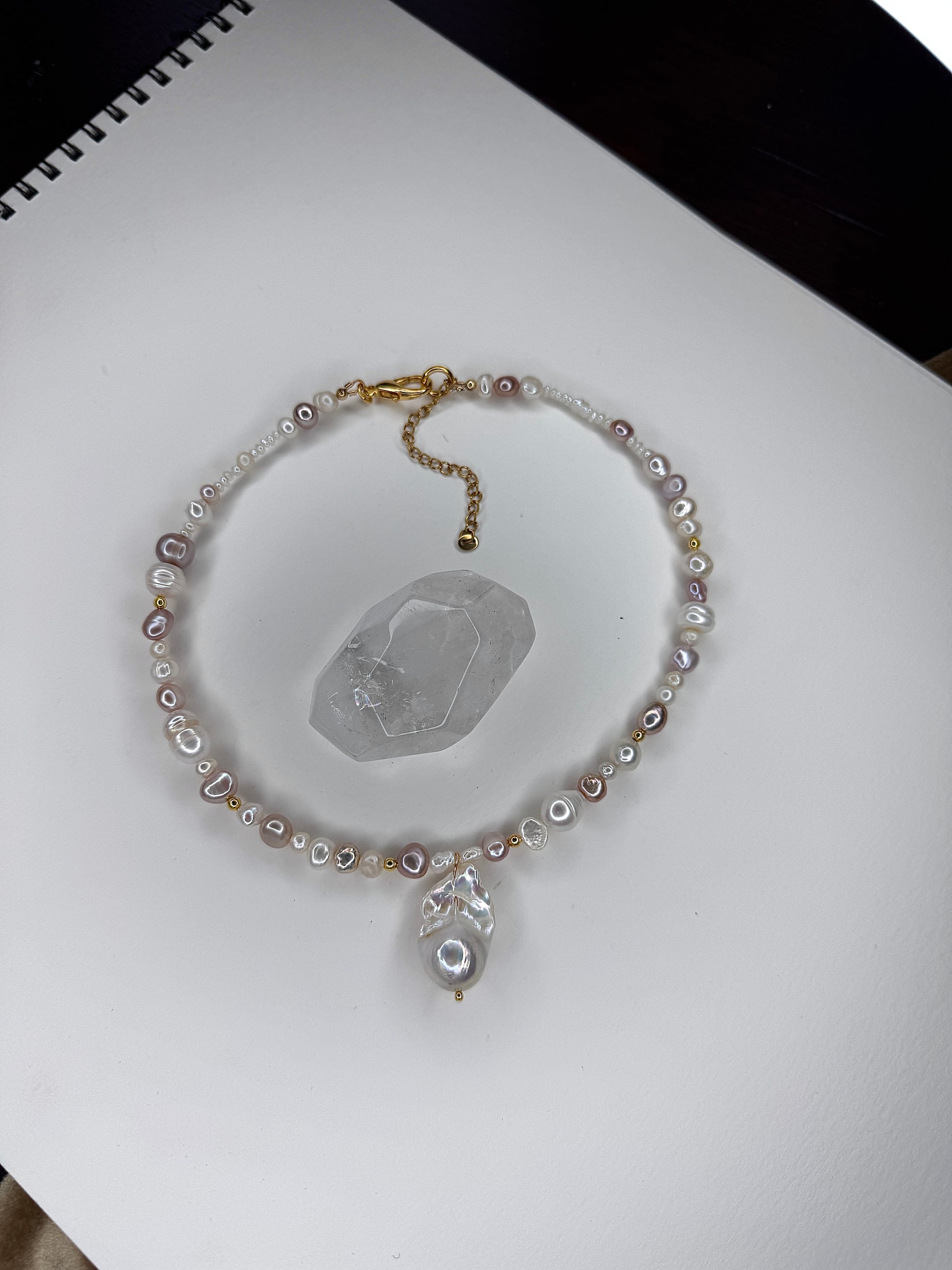 designed with high luster irregular freshwater pearls, pink freshwater pearls, and a fireball baroque pendant.