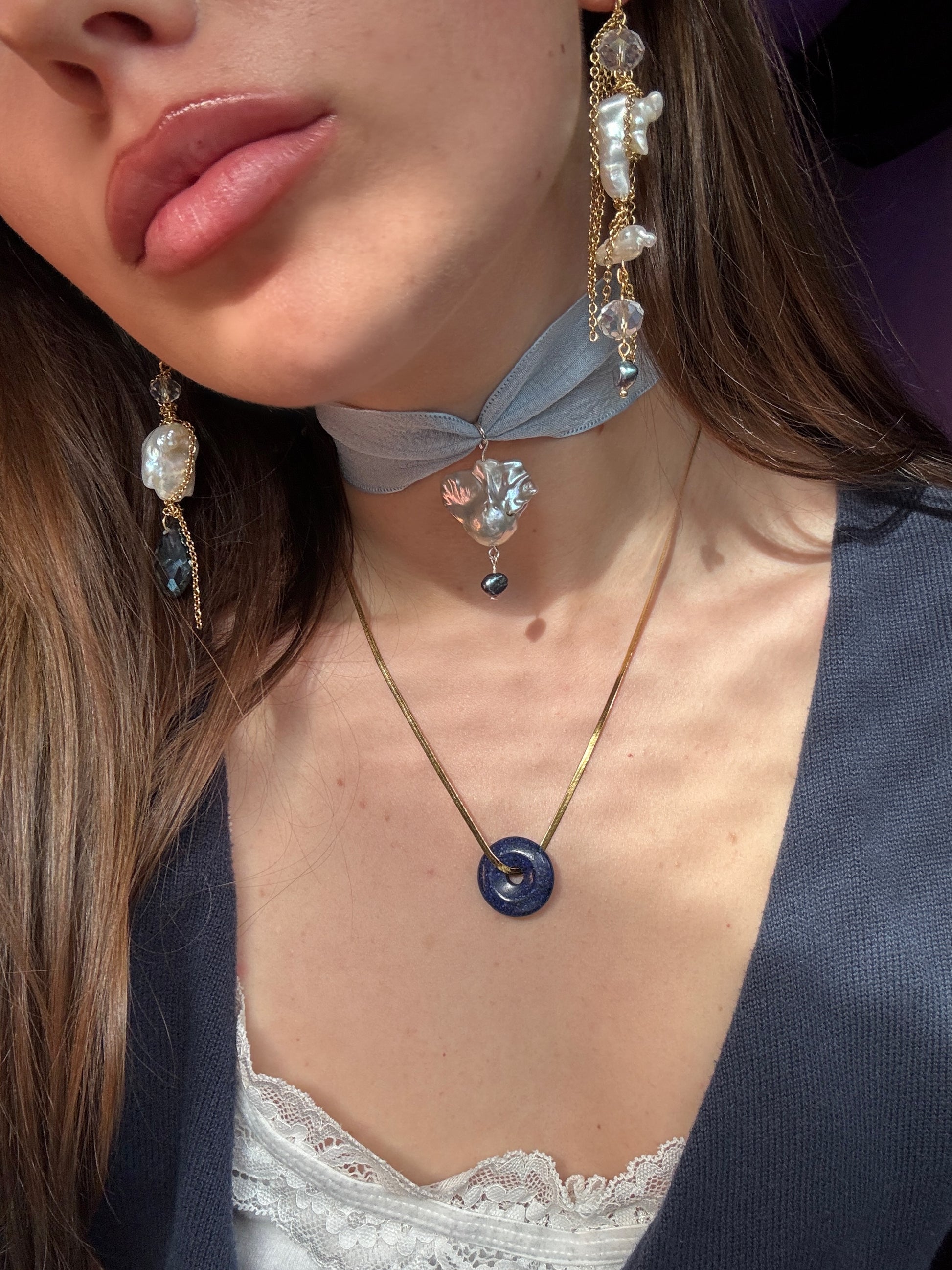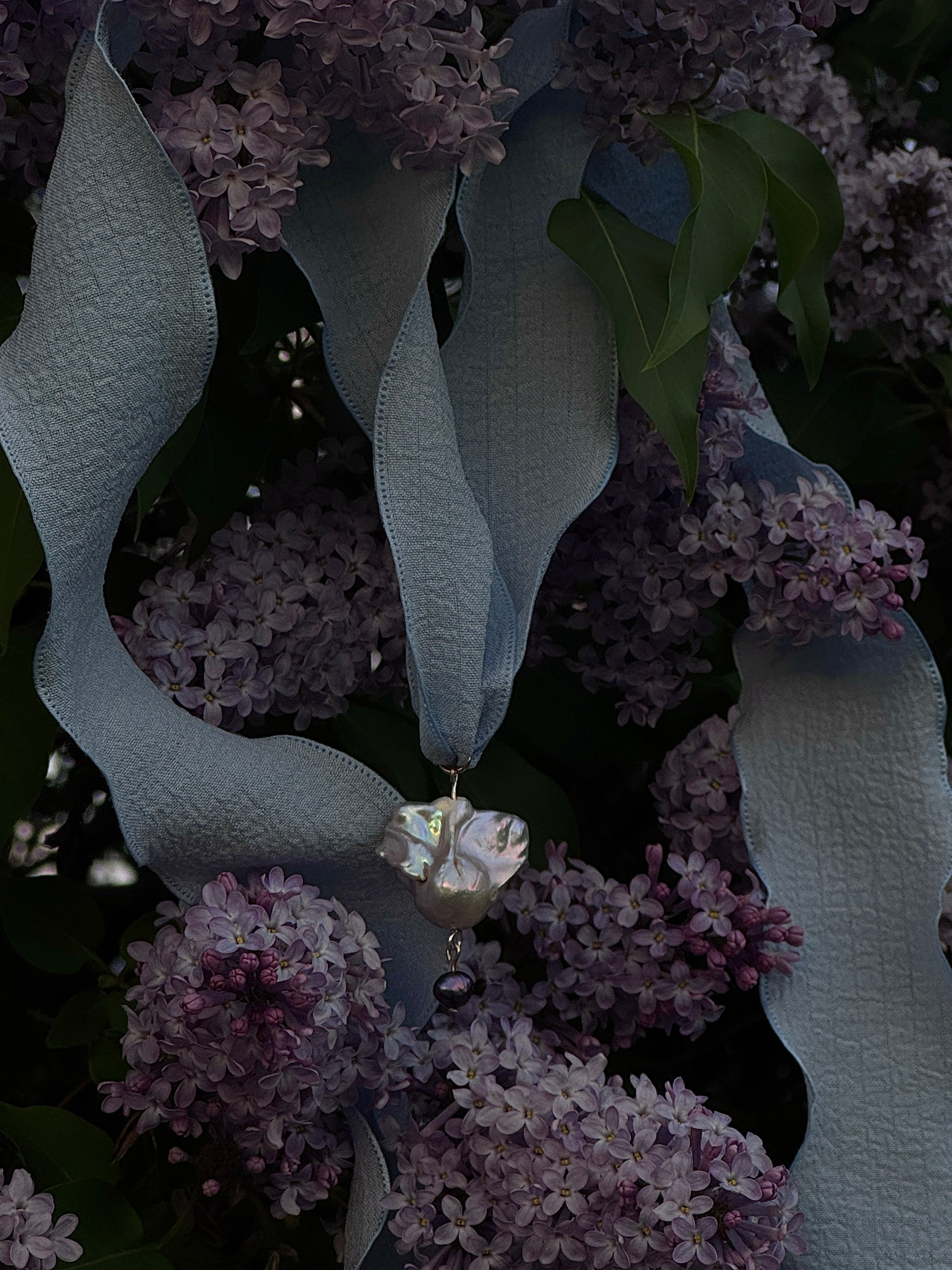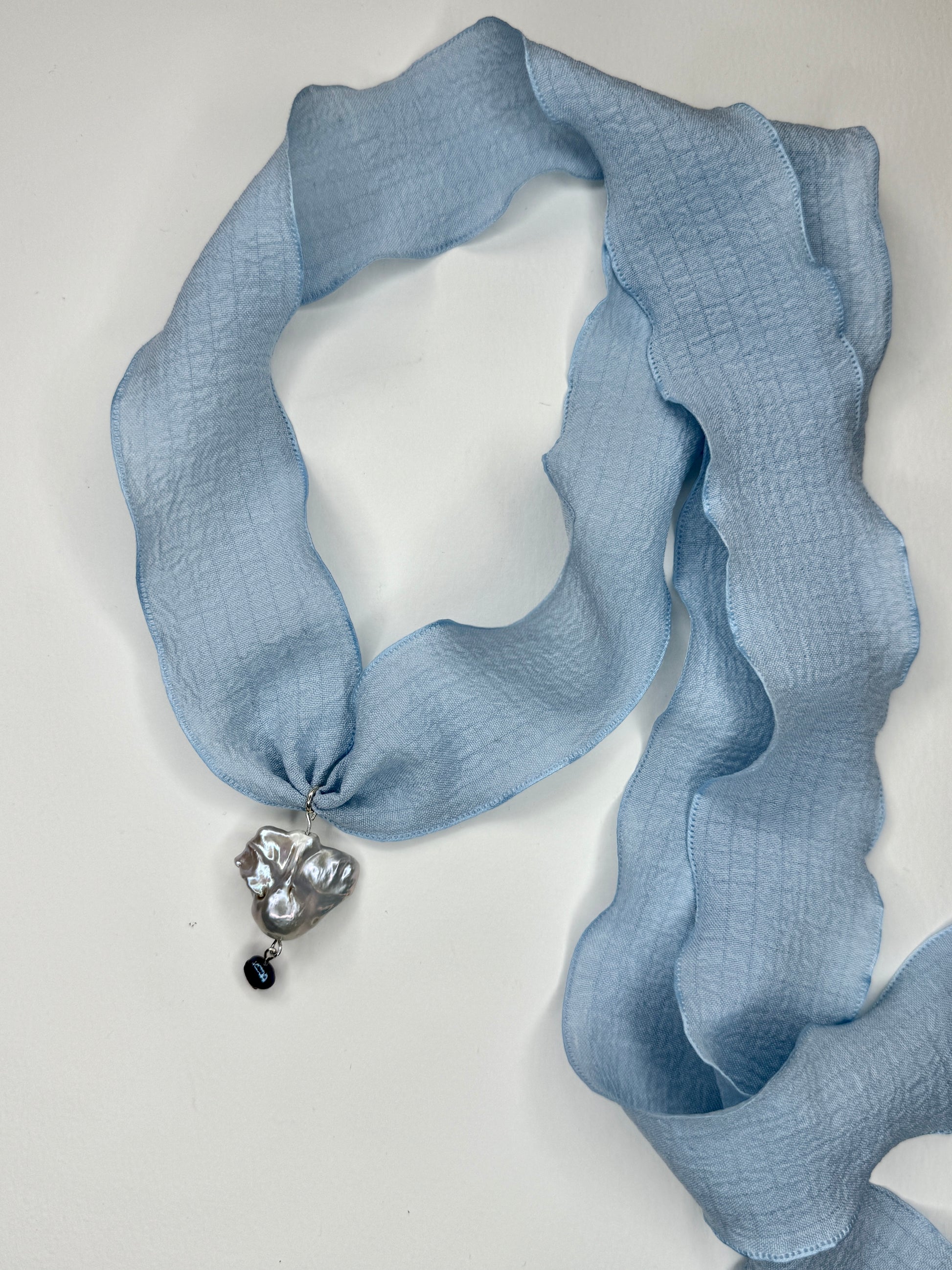 designed with a rare high luster silver baroque fishtail pearl, gold plated eyepin on an elegant ribbon tie
