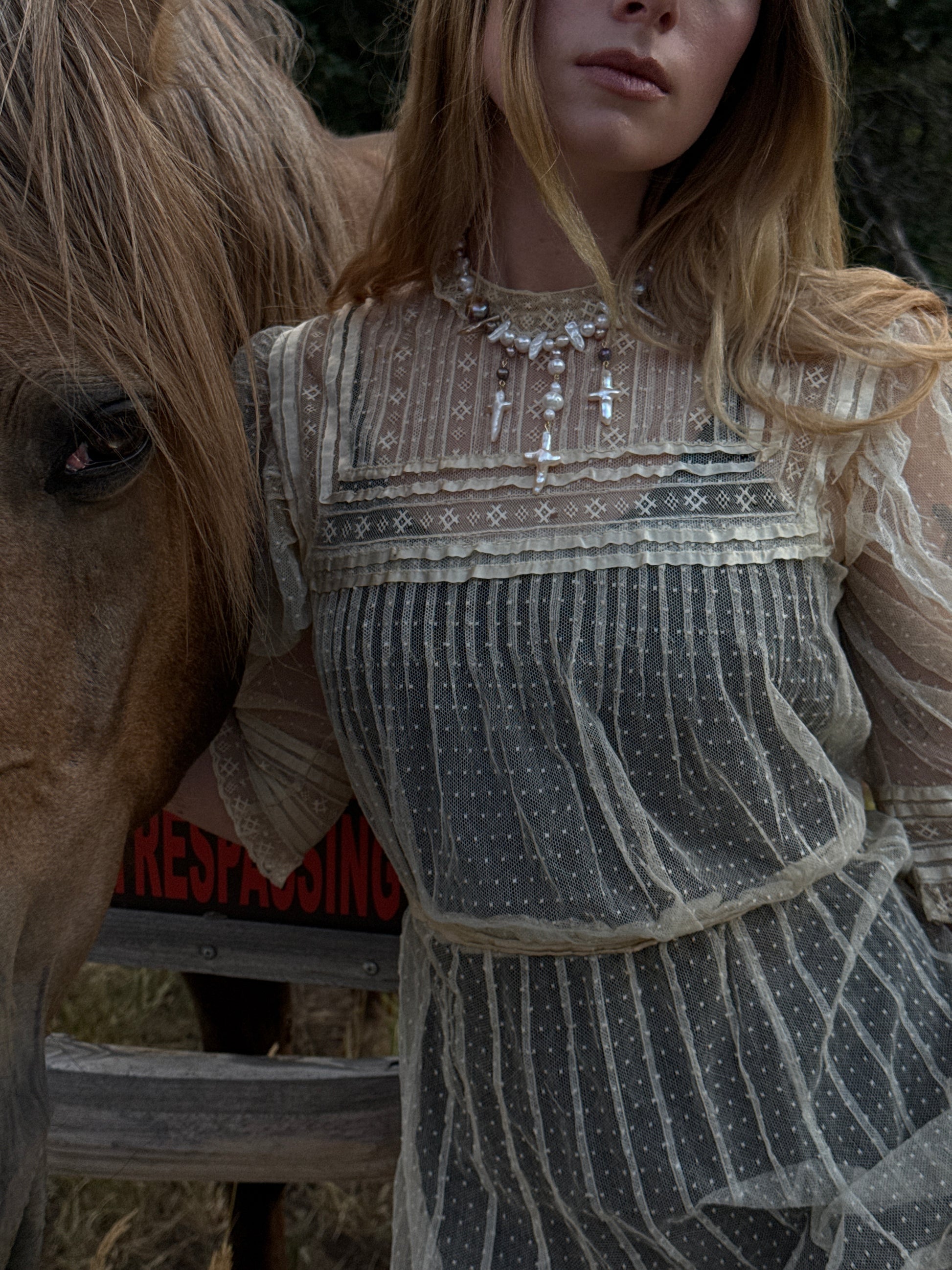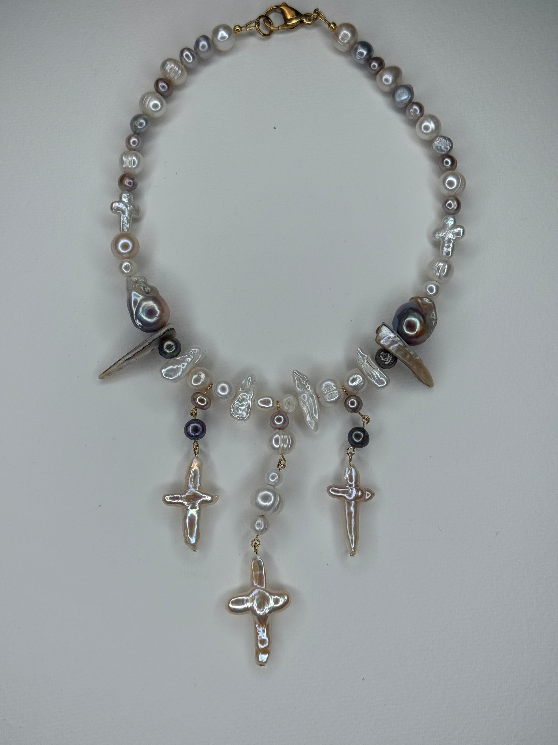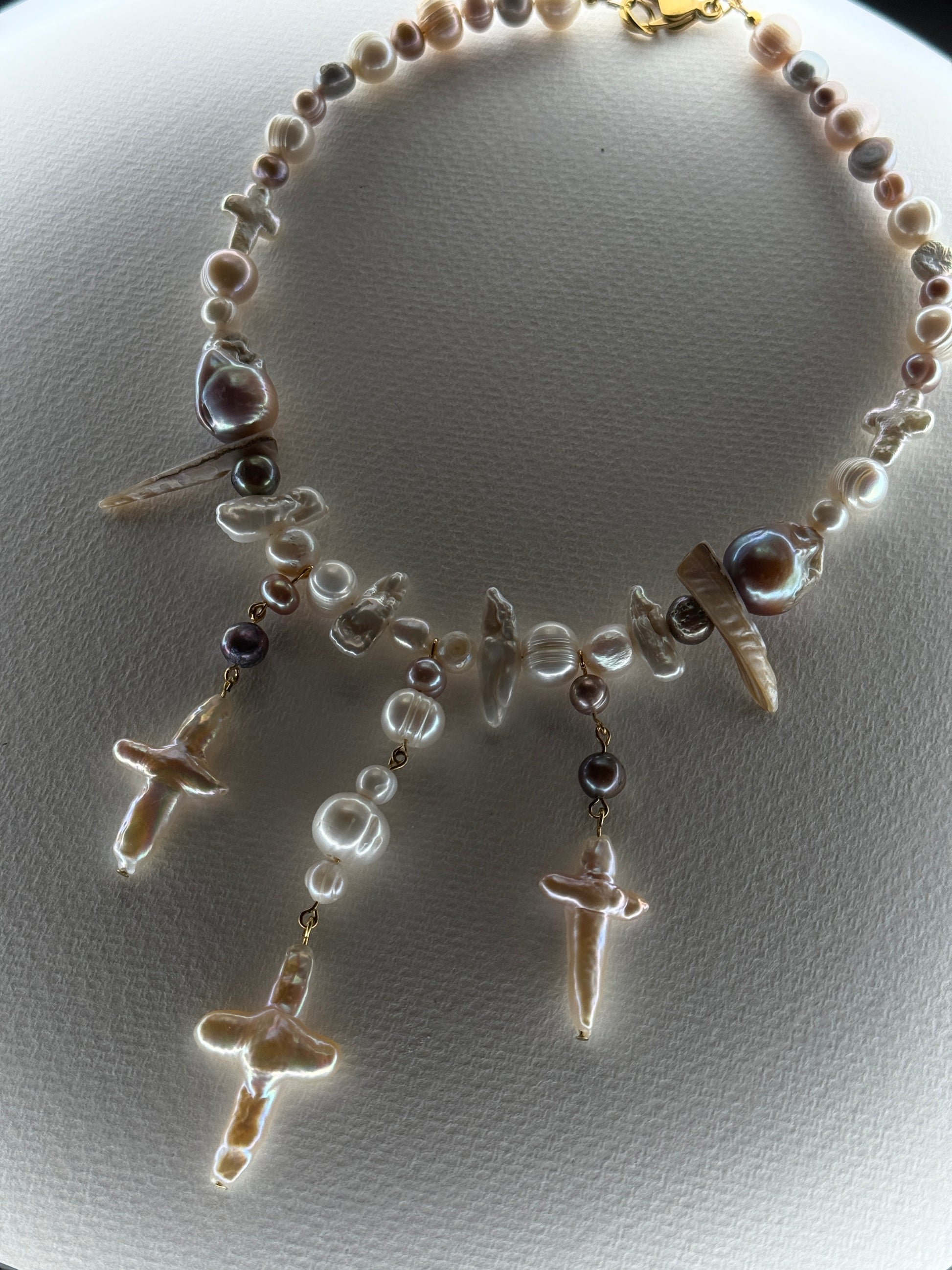 designed with high luster irregular baroque pearls, biwa / stick pearls, cross pearls, freshwater pearls