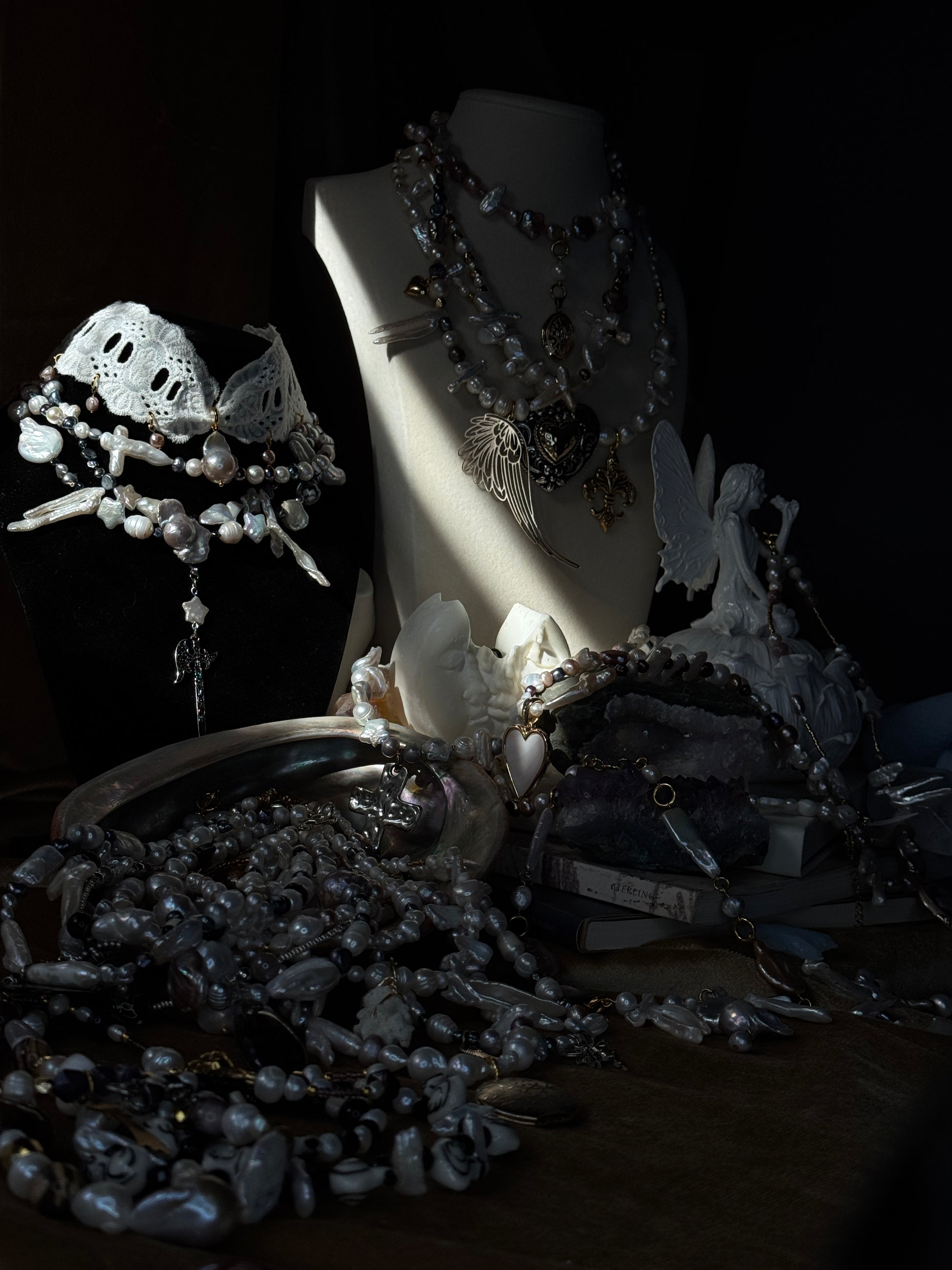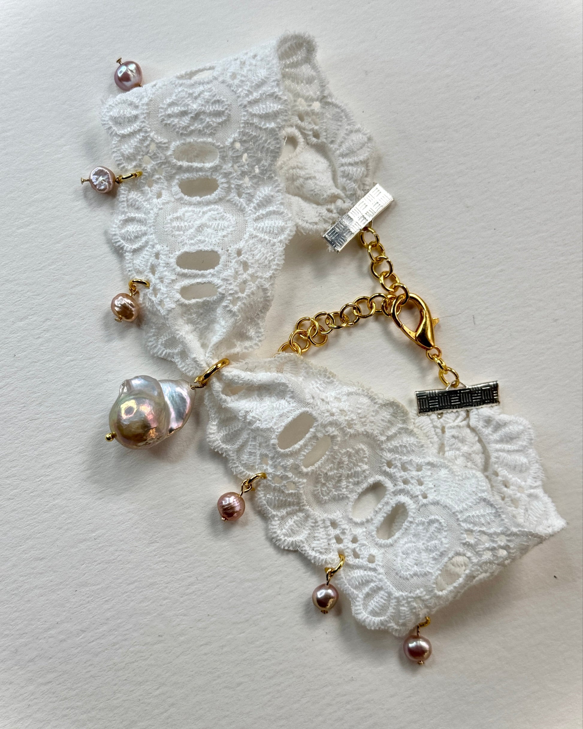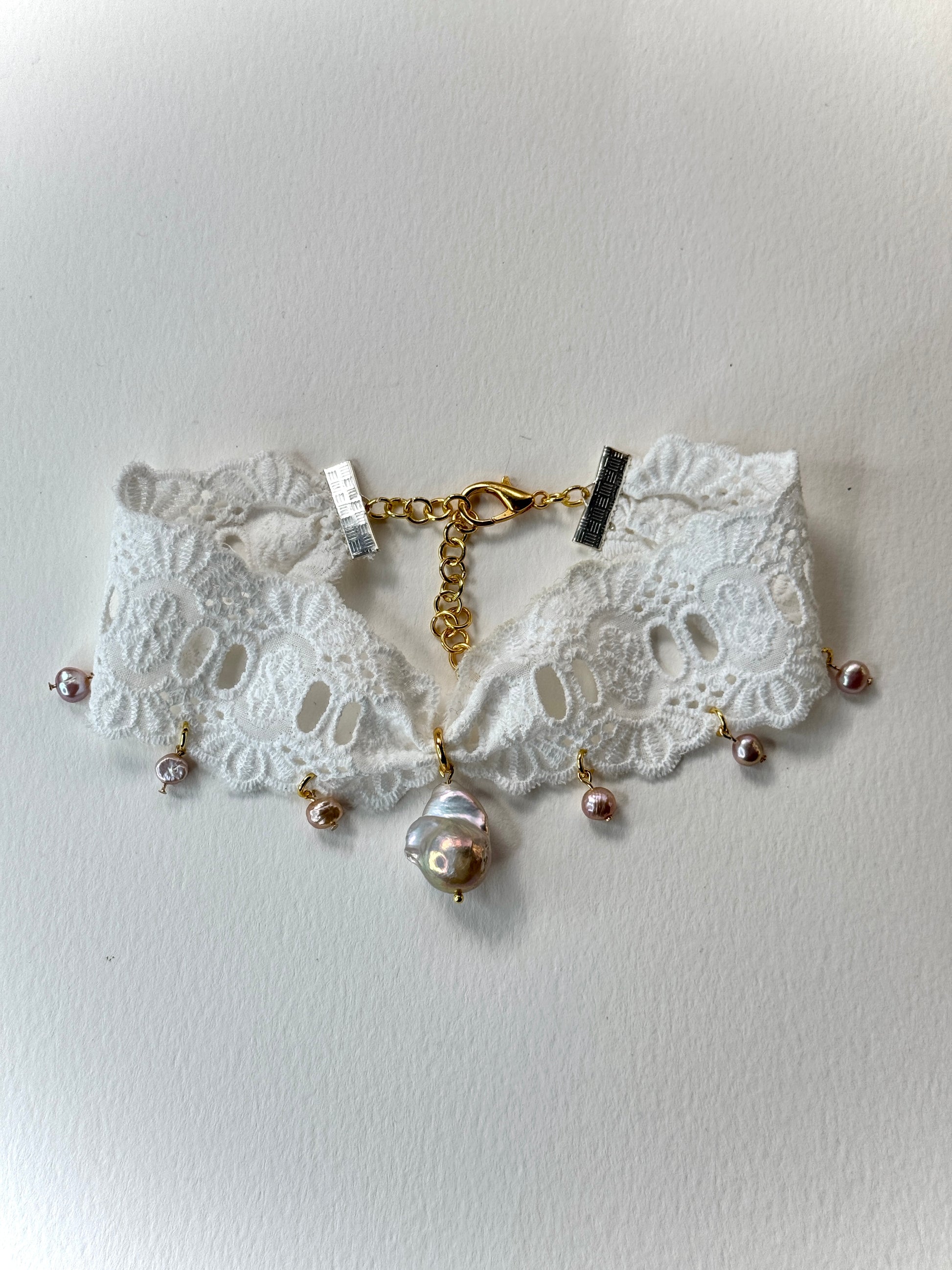 designed with a rare high luster silver baroque fishtail pearl, gold and silver plated hardware on an elegant ribbon with adjustable length
