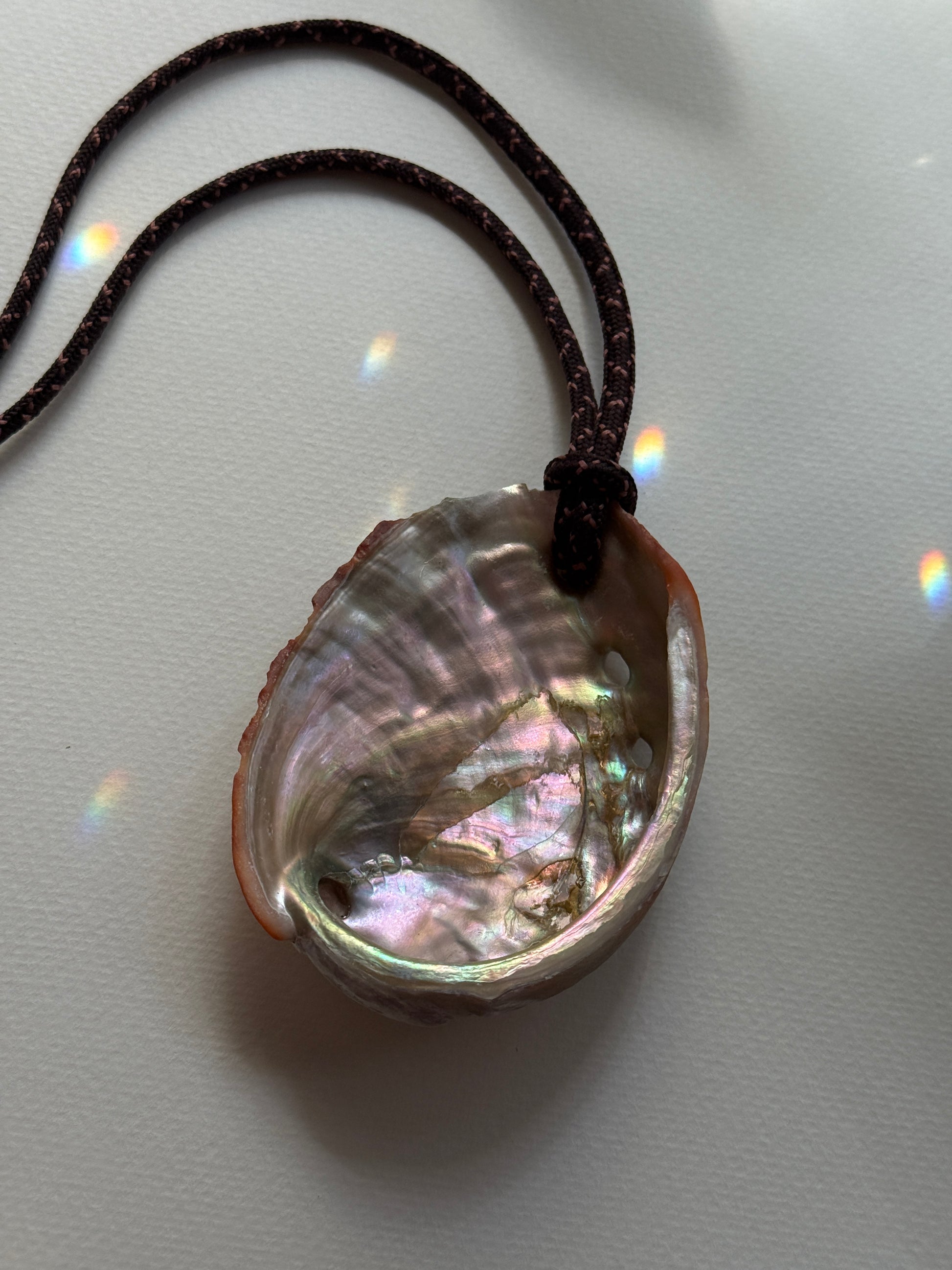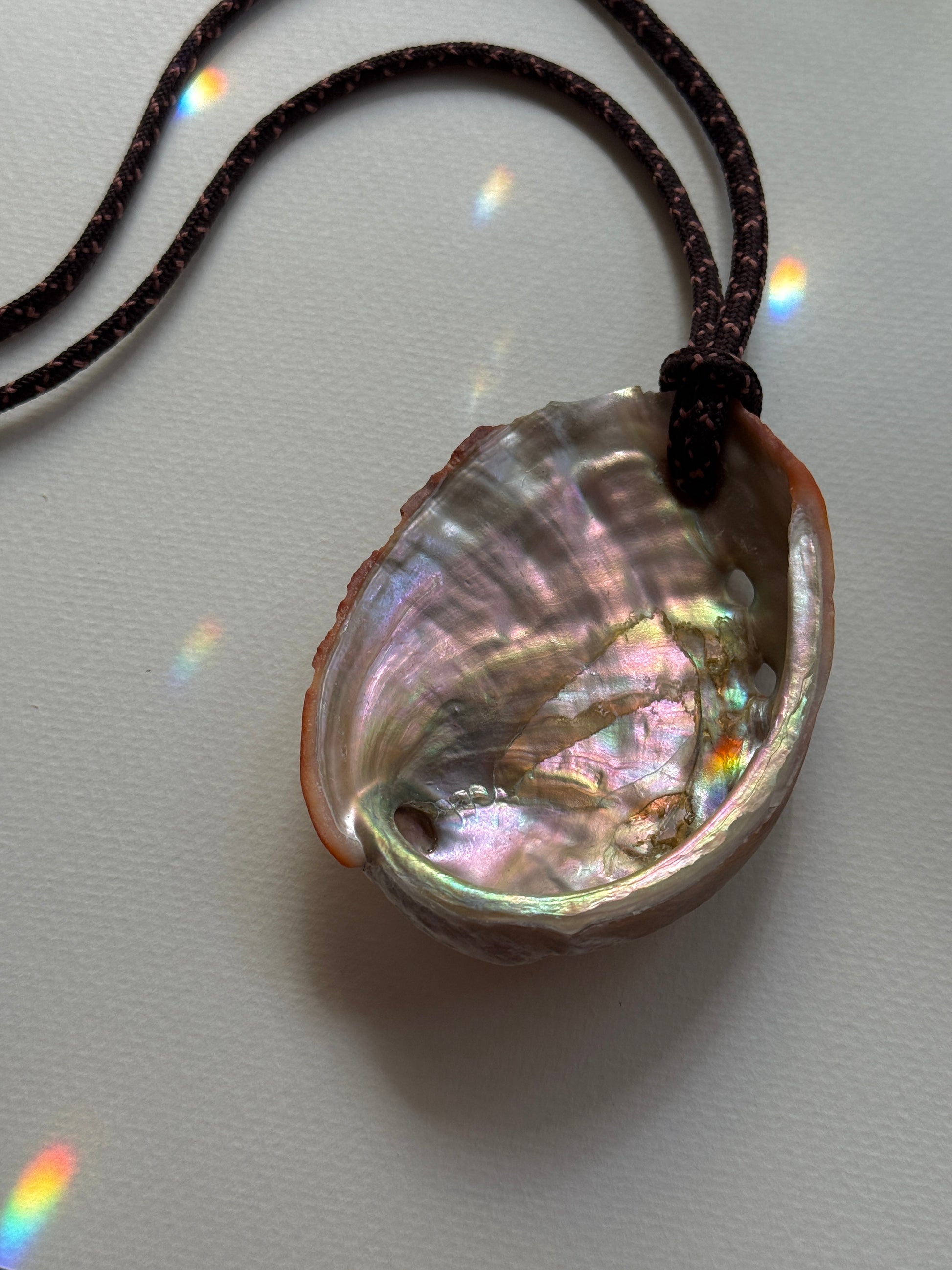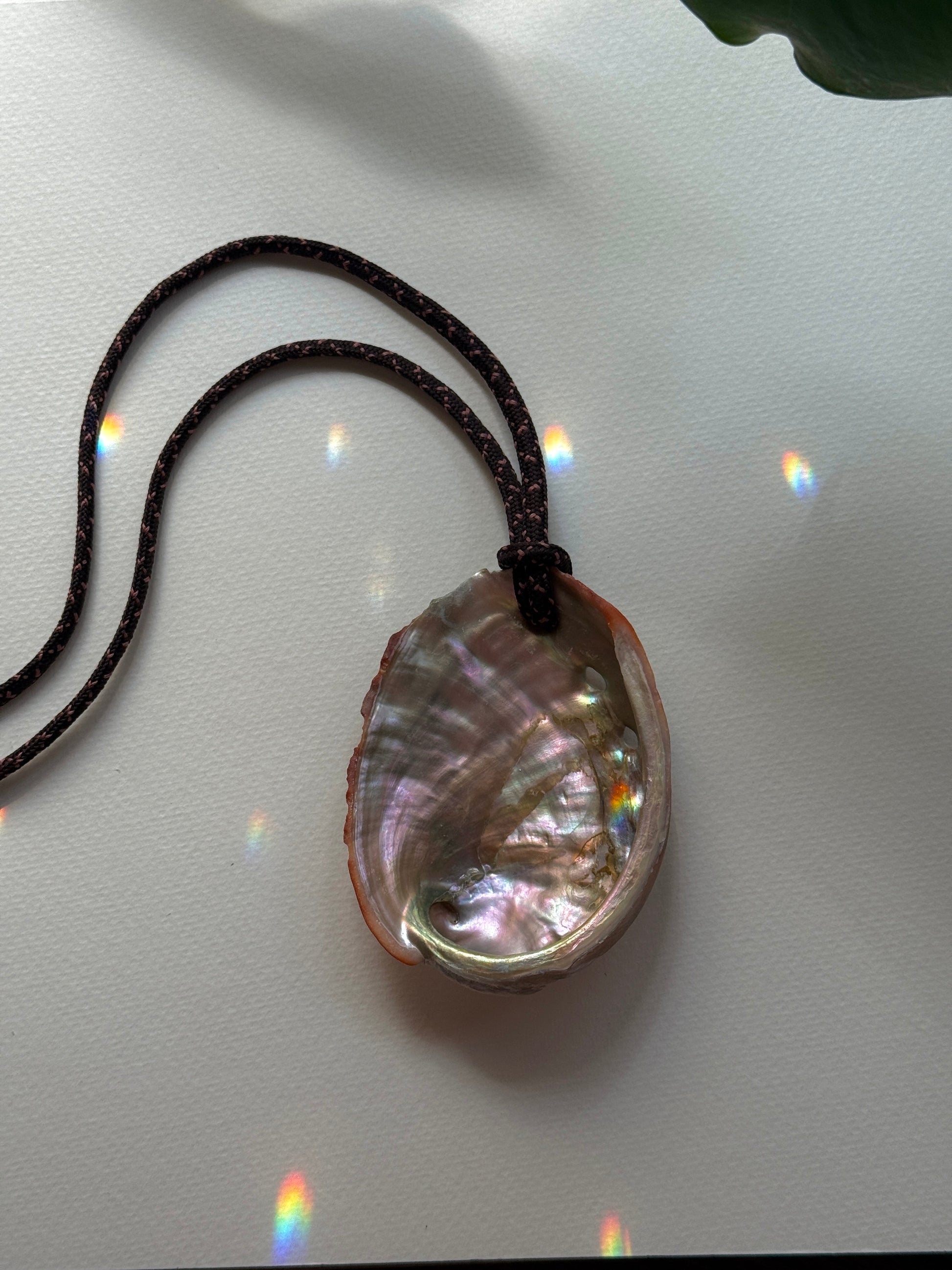 natural deep brown paracord with large abalone shell and slide knots for adjustable length