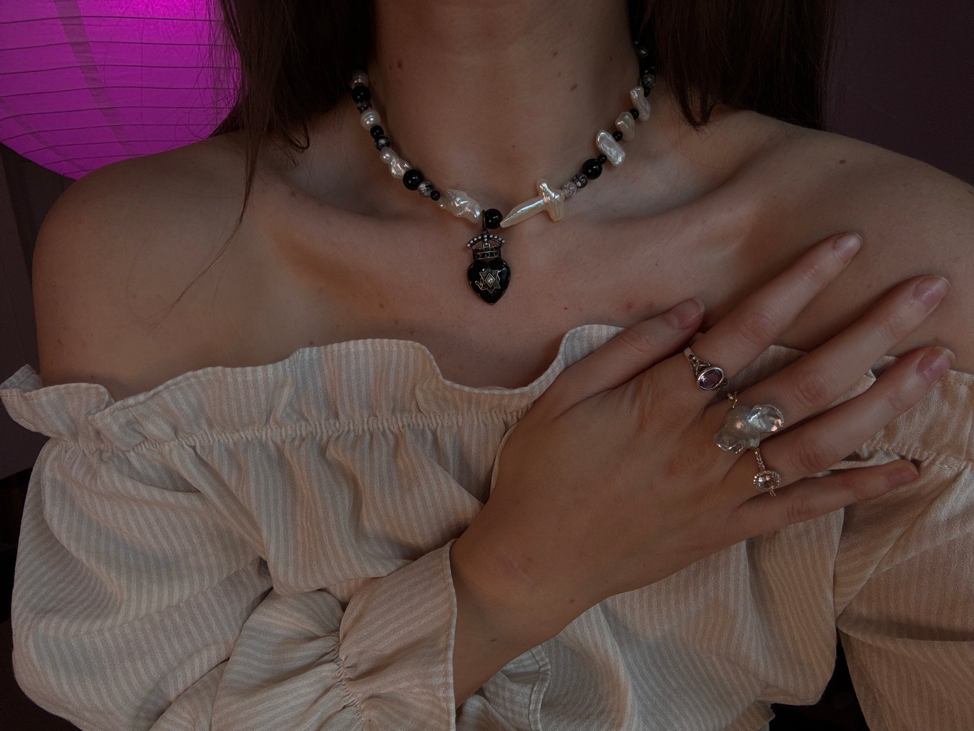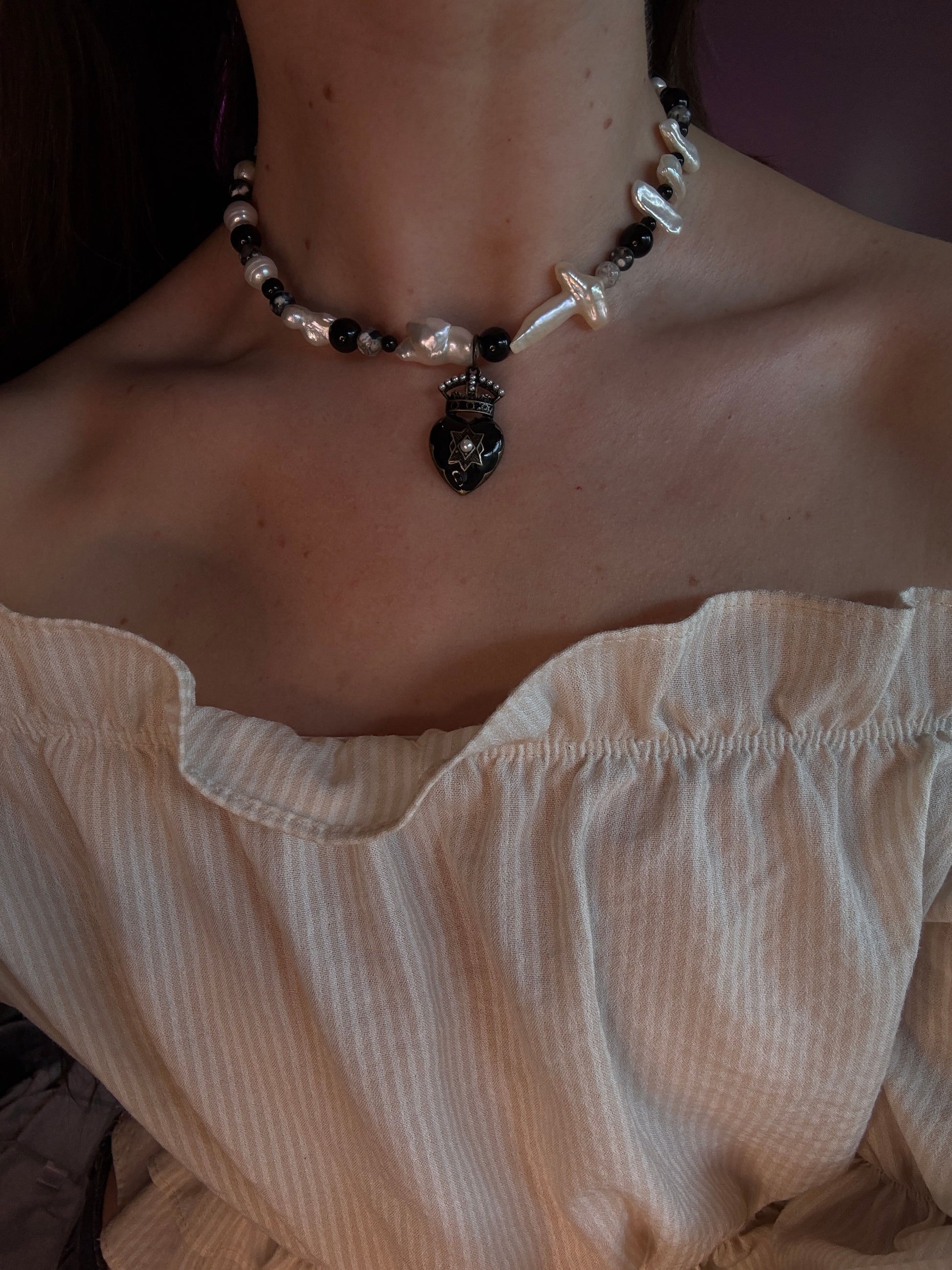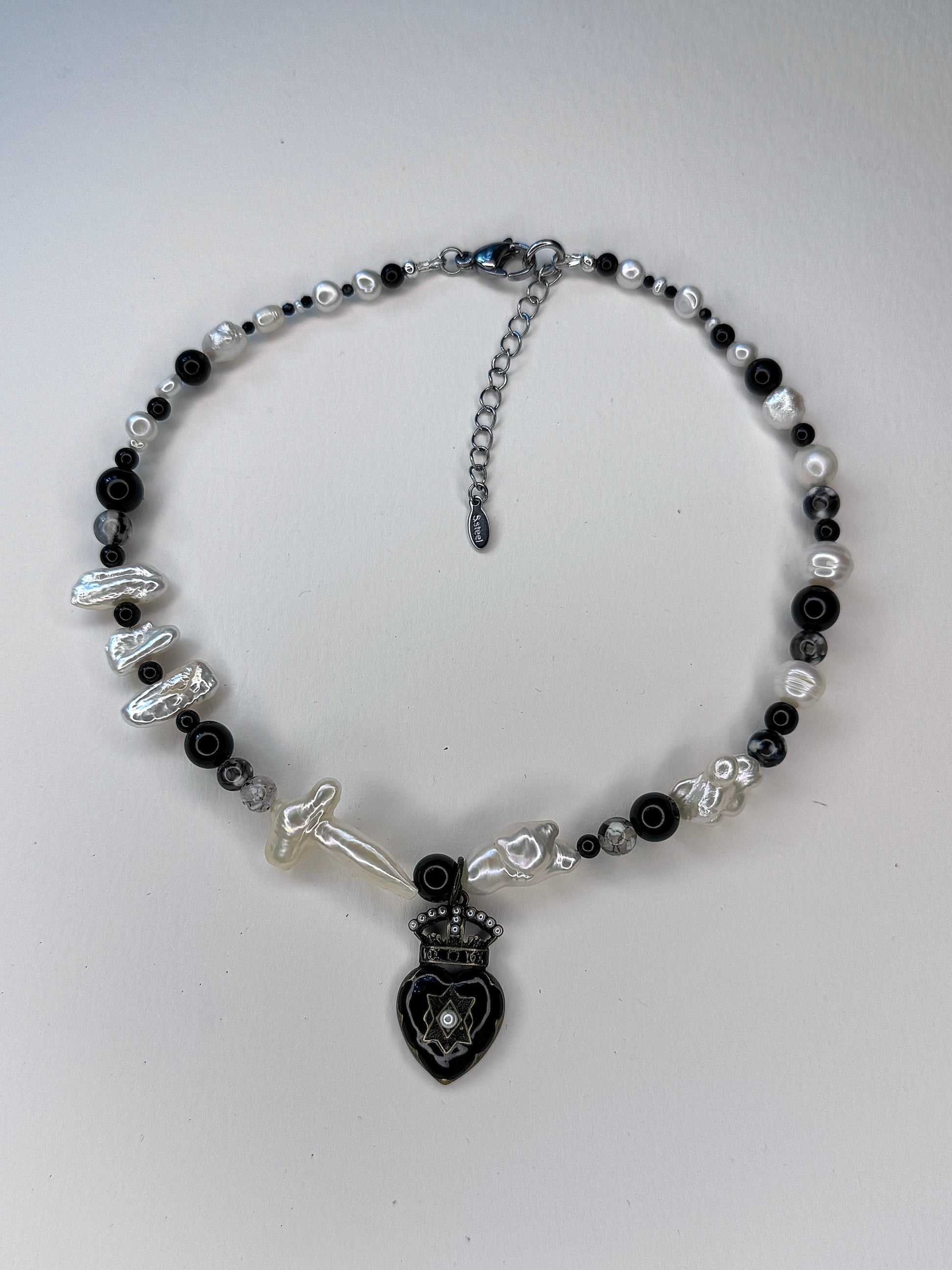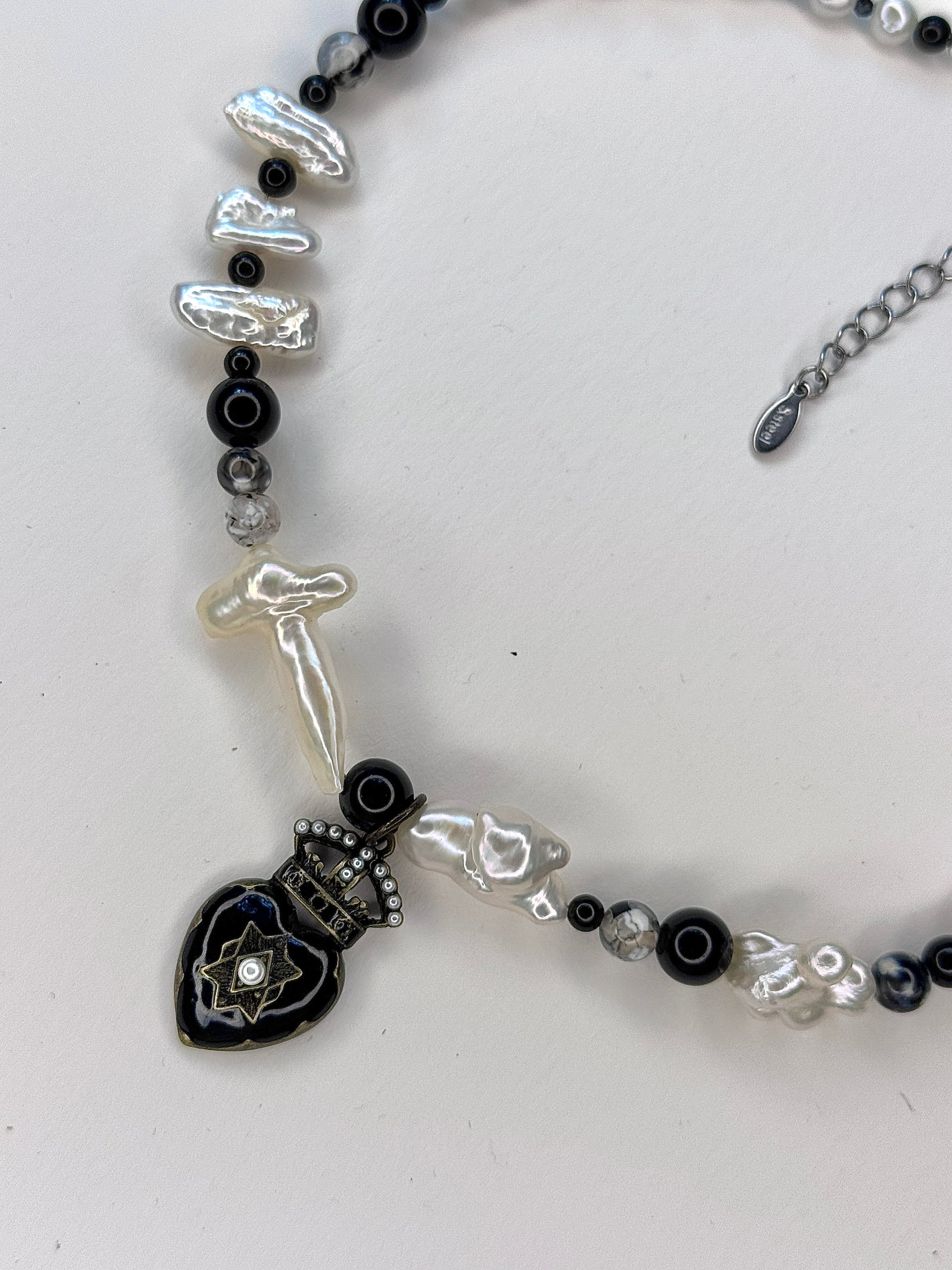 designed with rare baroque pearls, biwa, cross, irregular freshwater pearls, round fire agate, round obsidian and glass beads adorned with a zinc alloy and glass sacred heart pendant.