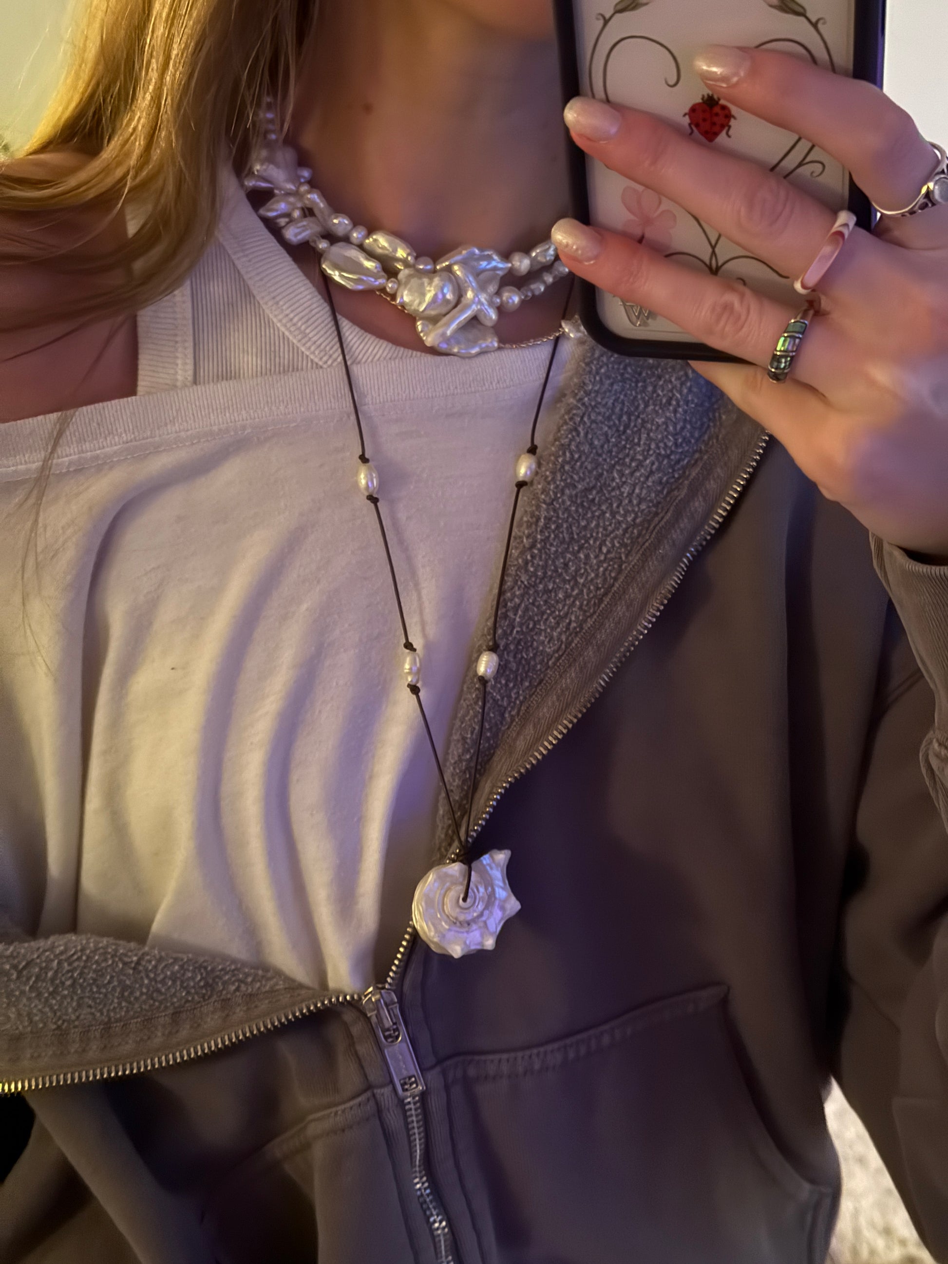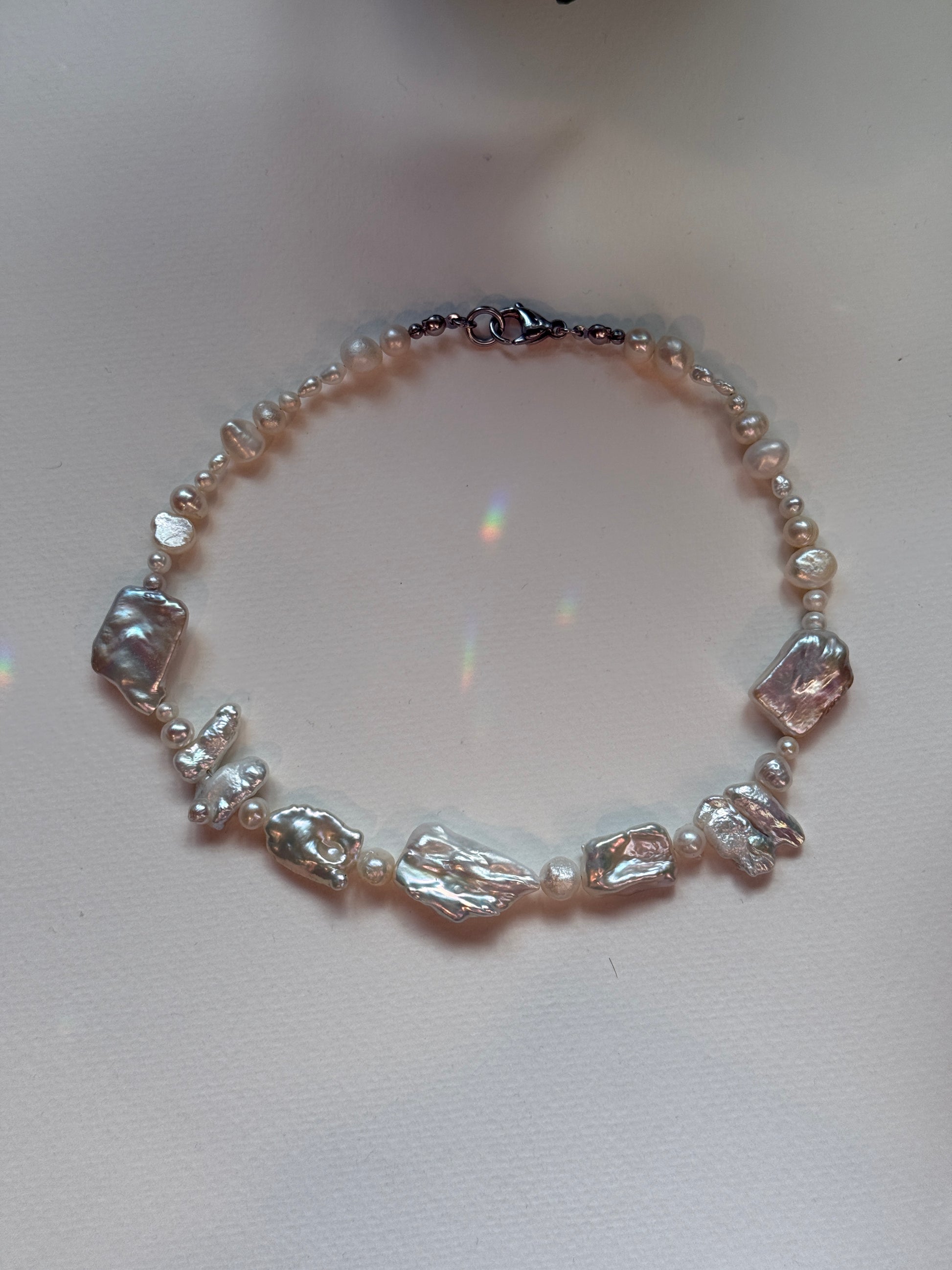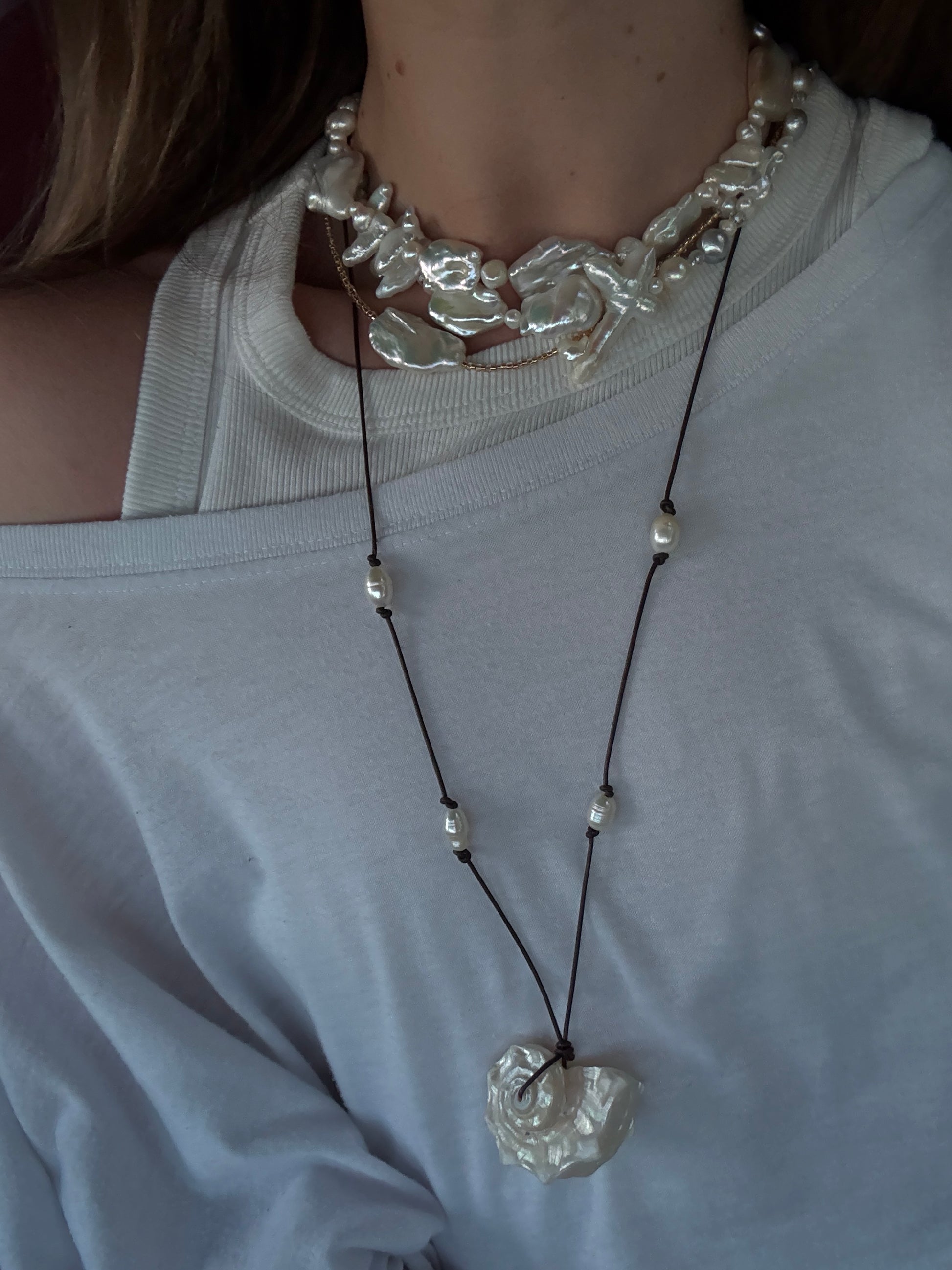 designed with high luster irregular baroque pearls, fireball baroque centerpiece, baroque cross pearl, stick pearl, freshwater pearls, stainless gold plated chain and hardware.