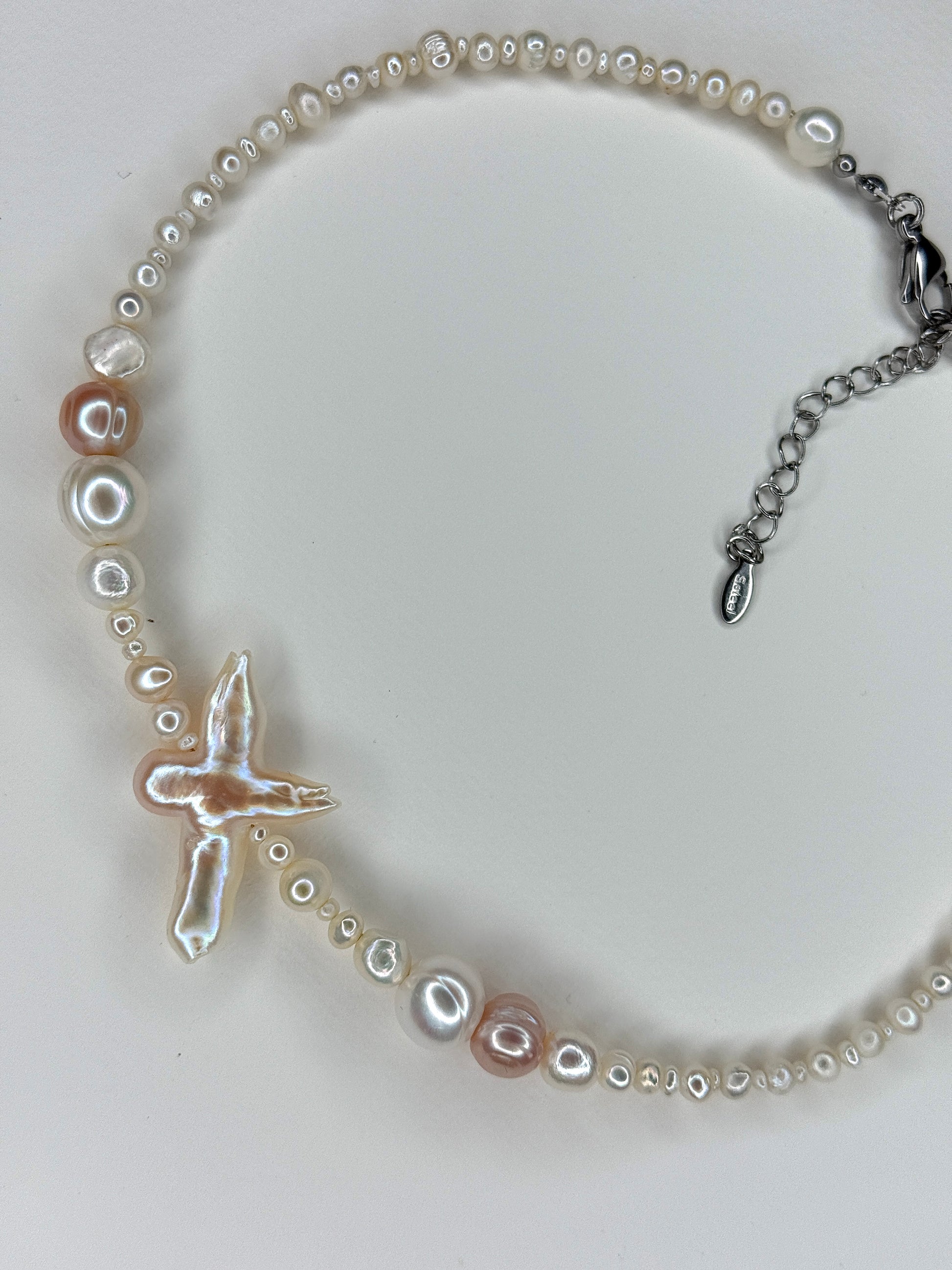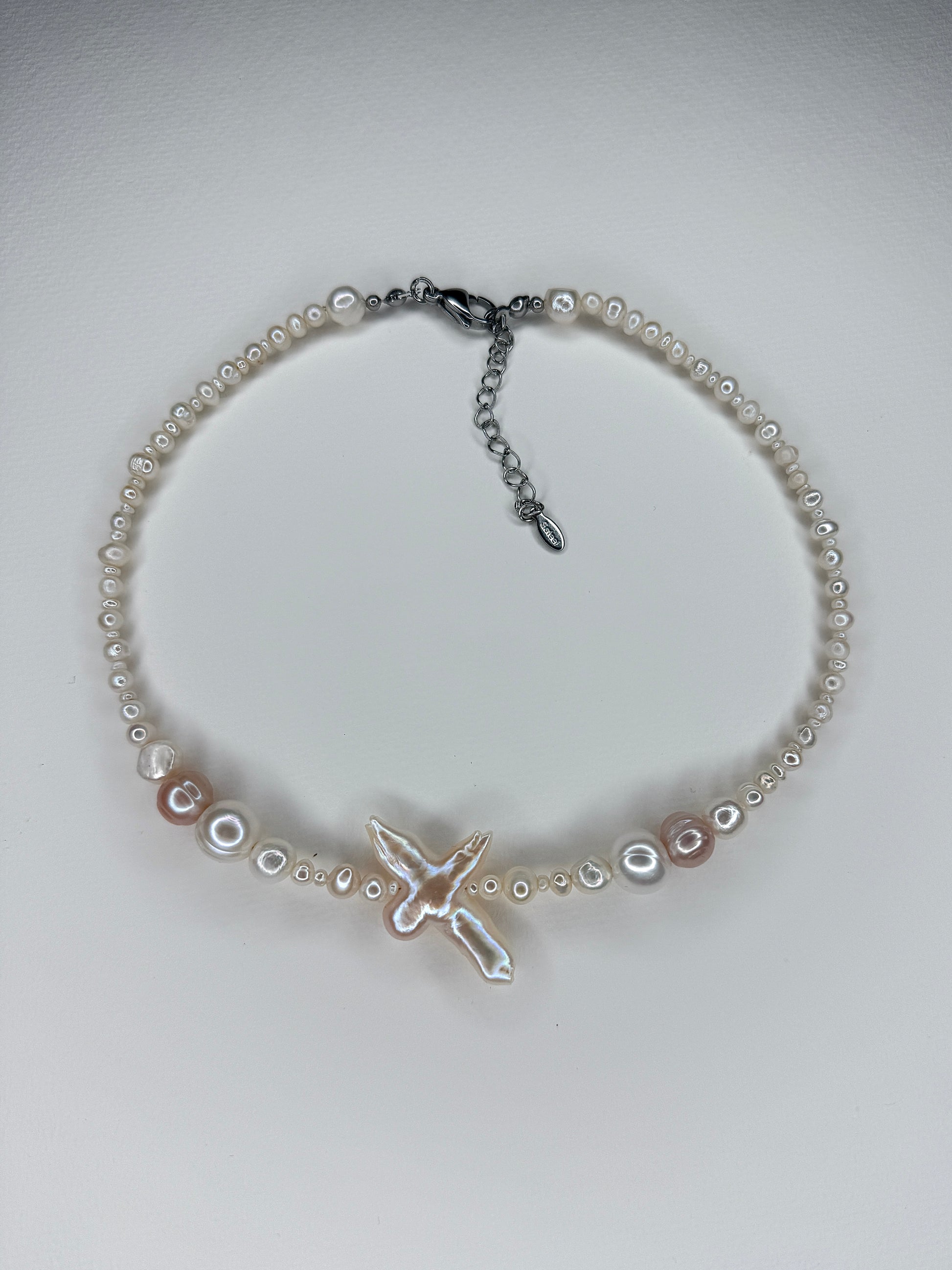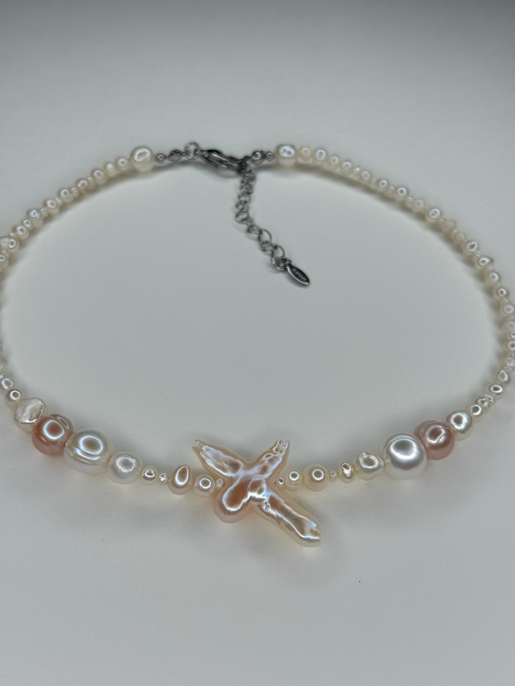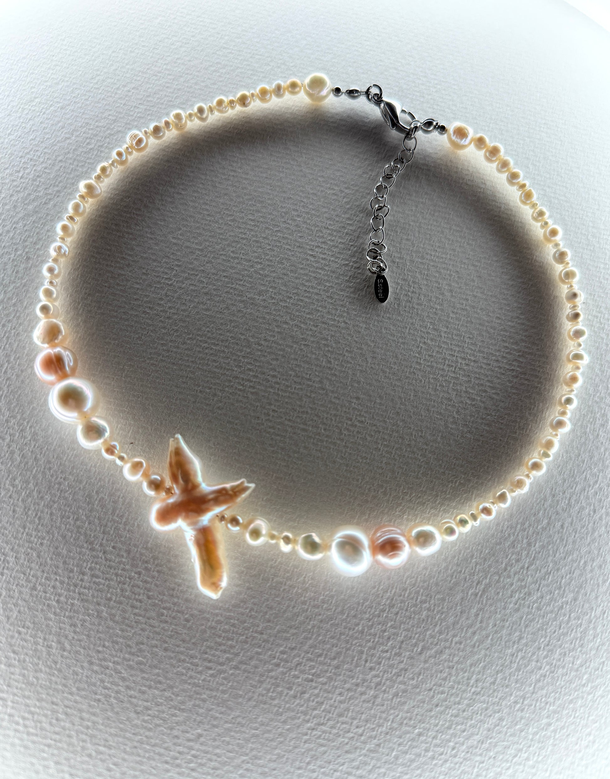 designed with high luster irregular baroque pearls, biwa / stick pearls, cross pearls, freshwater pearls