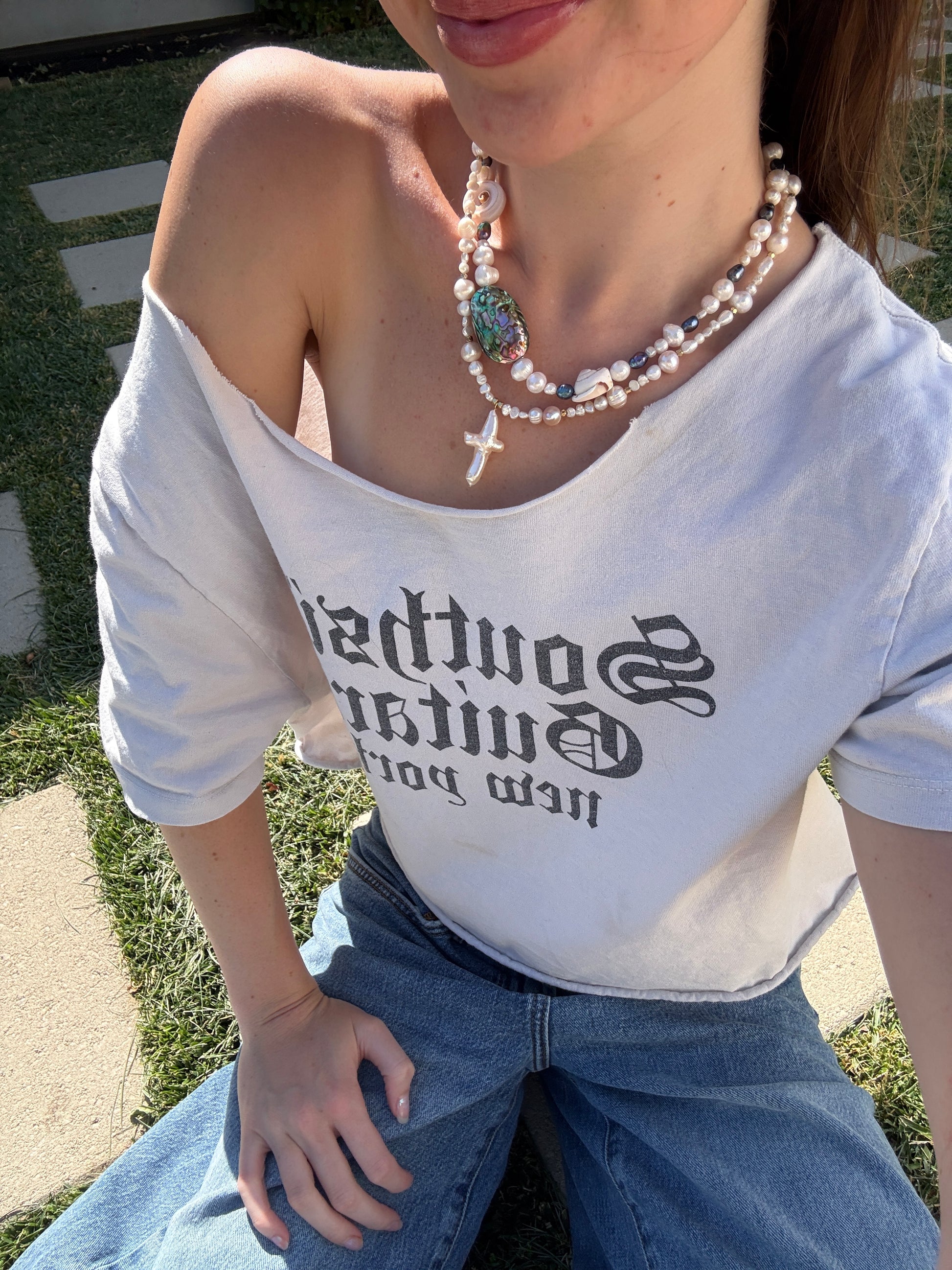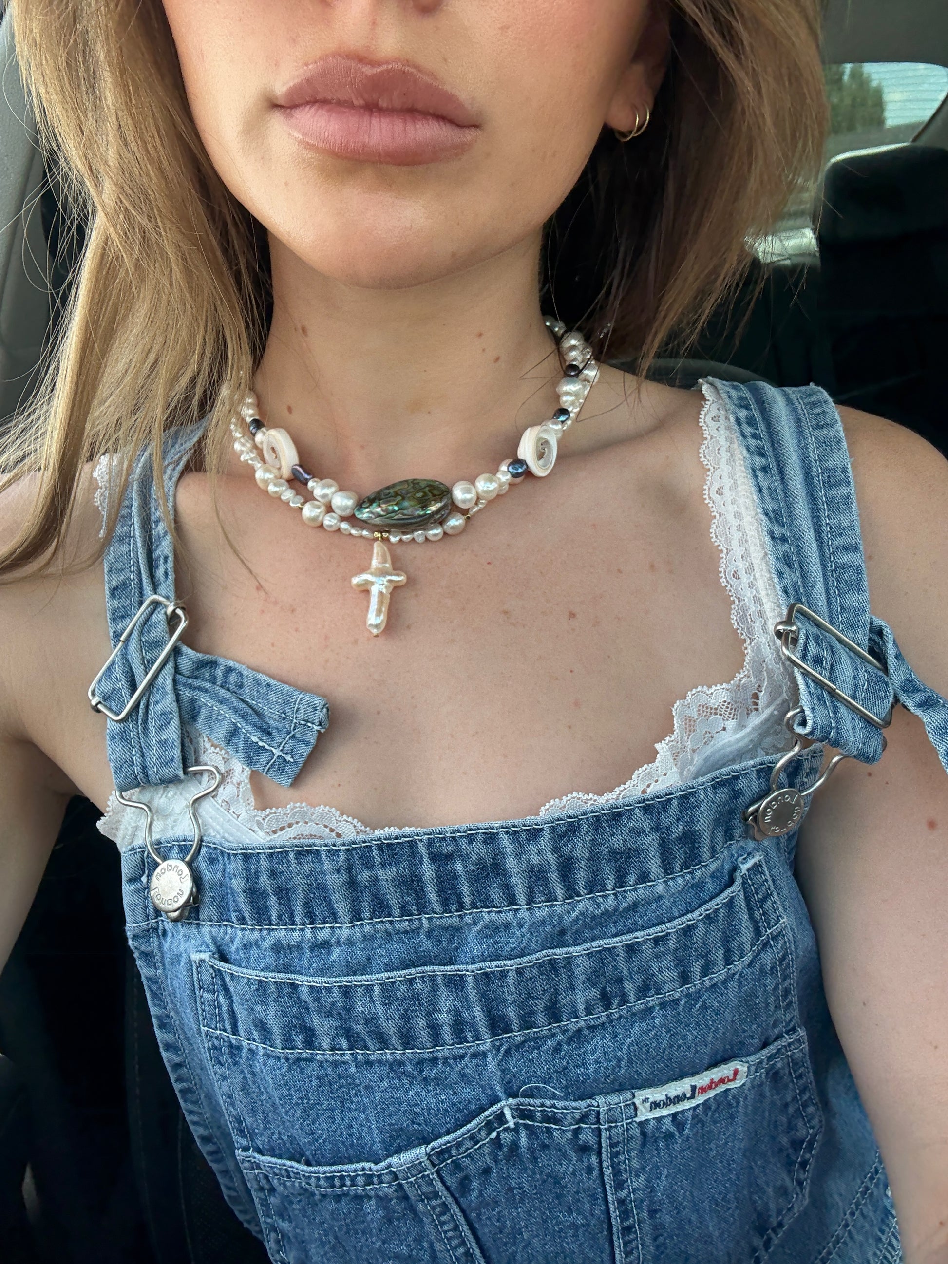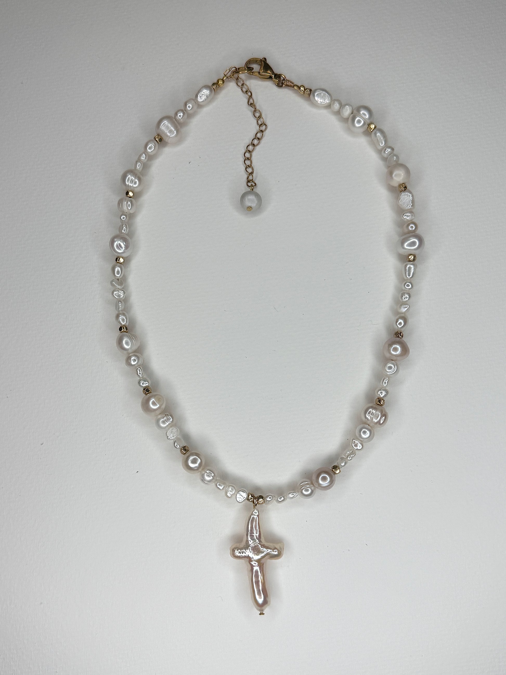 designed with high luster irregular baroque pearls, biwa / stick pearls, cross pearls, freshwater pearls