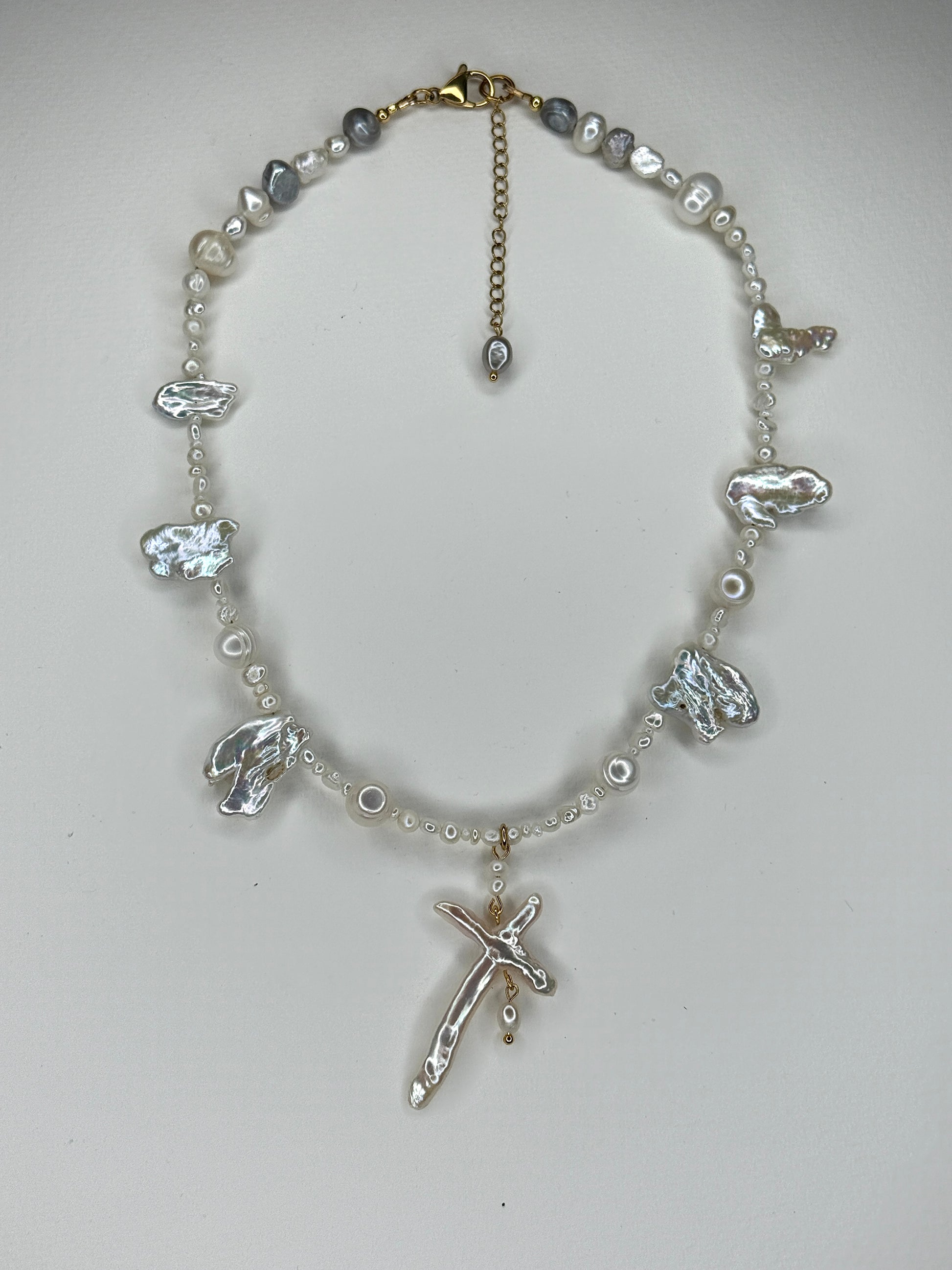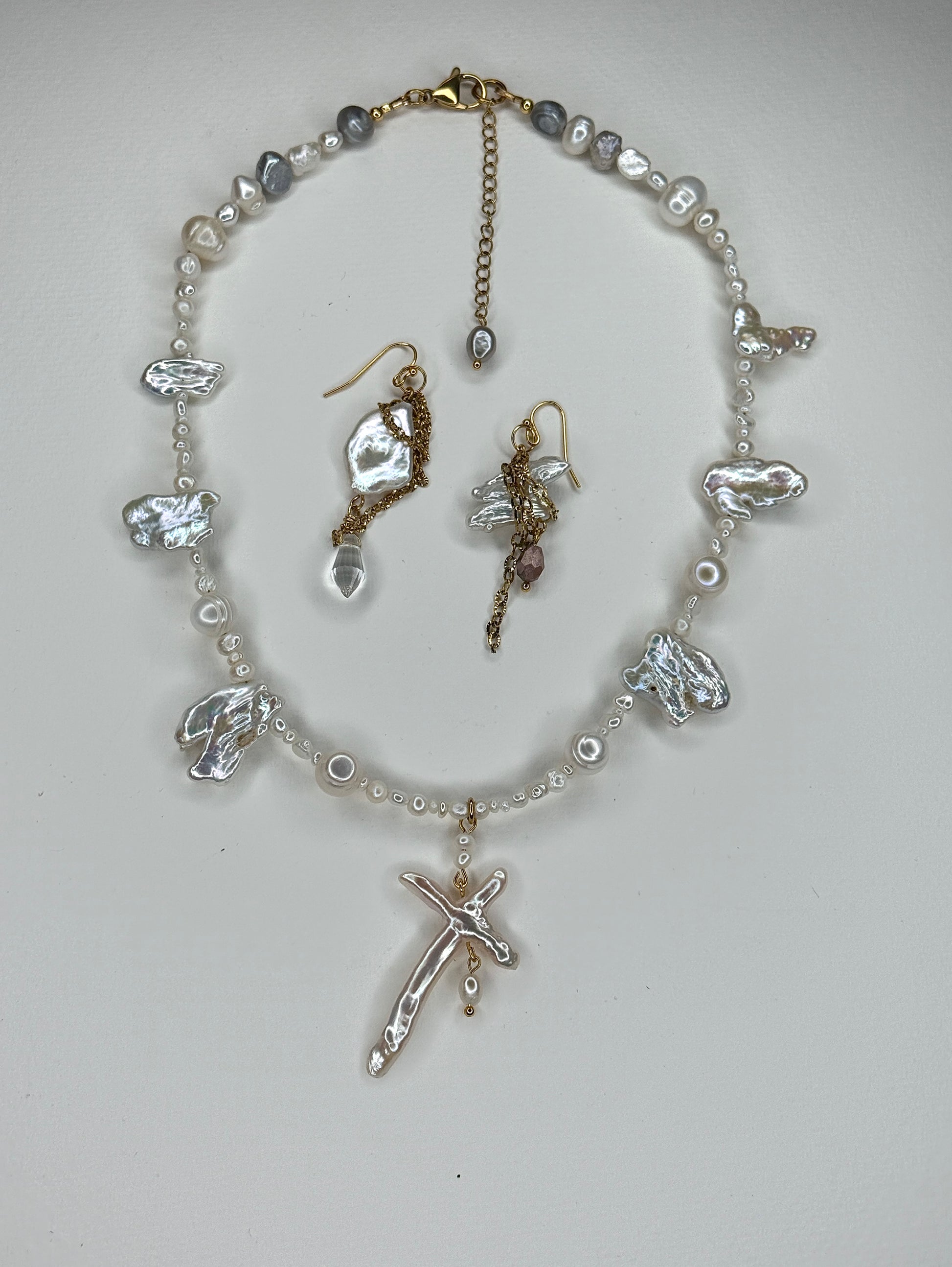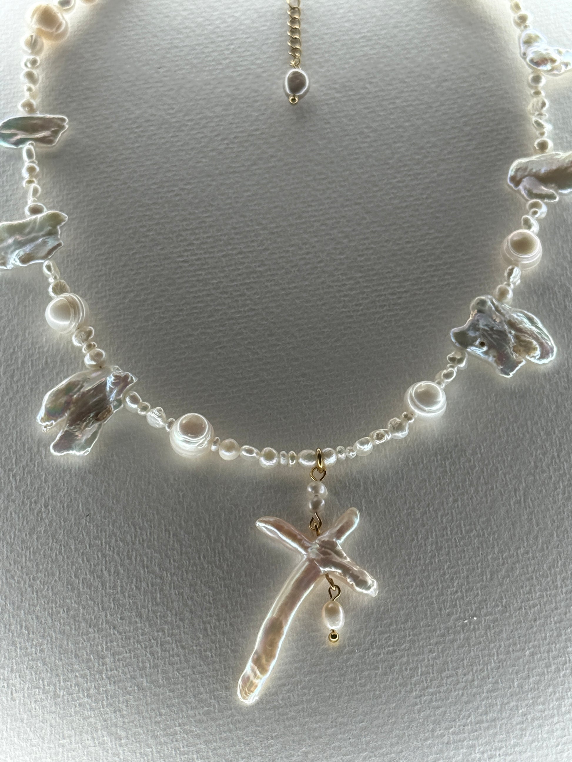 designed with high luster irregular baroque pearls, biwa / stick pearls, cross pearls, freshwater pearls