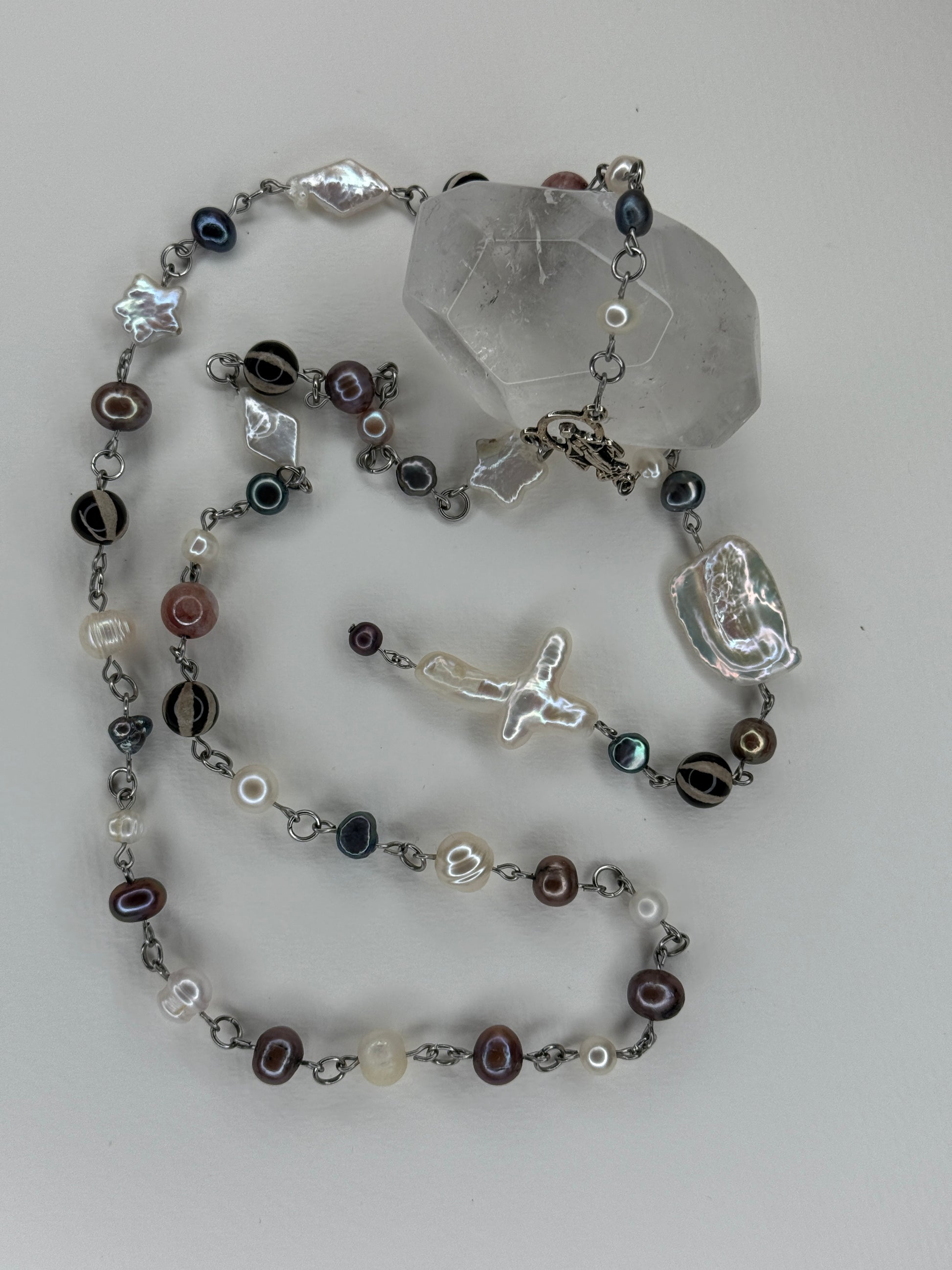 zebra agate, sunstone, purple pearl, blue pearl, baroque pearl, keshi pearl, star pearl cross pearl on stainless steel chain