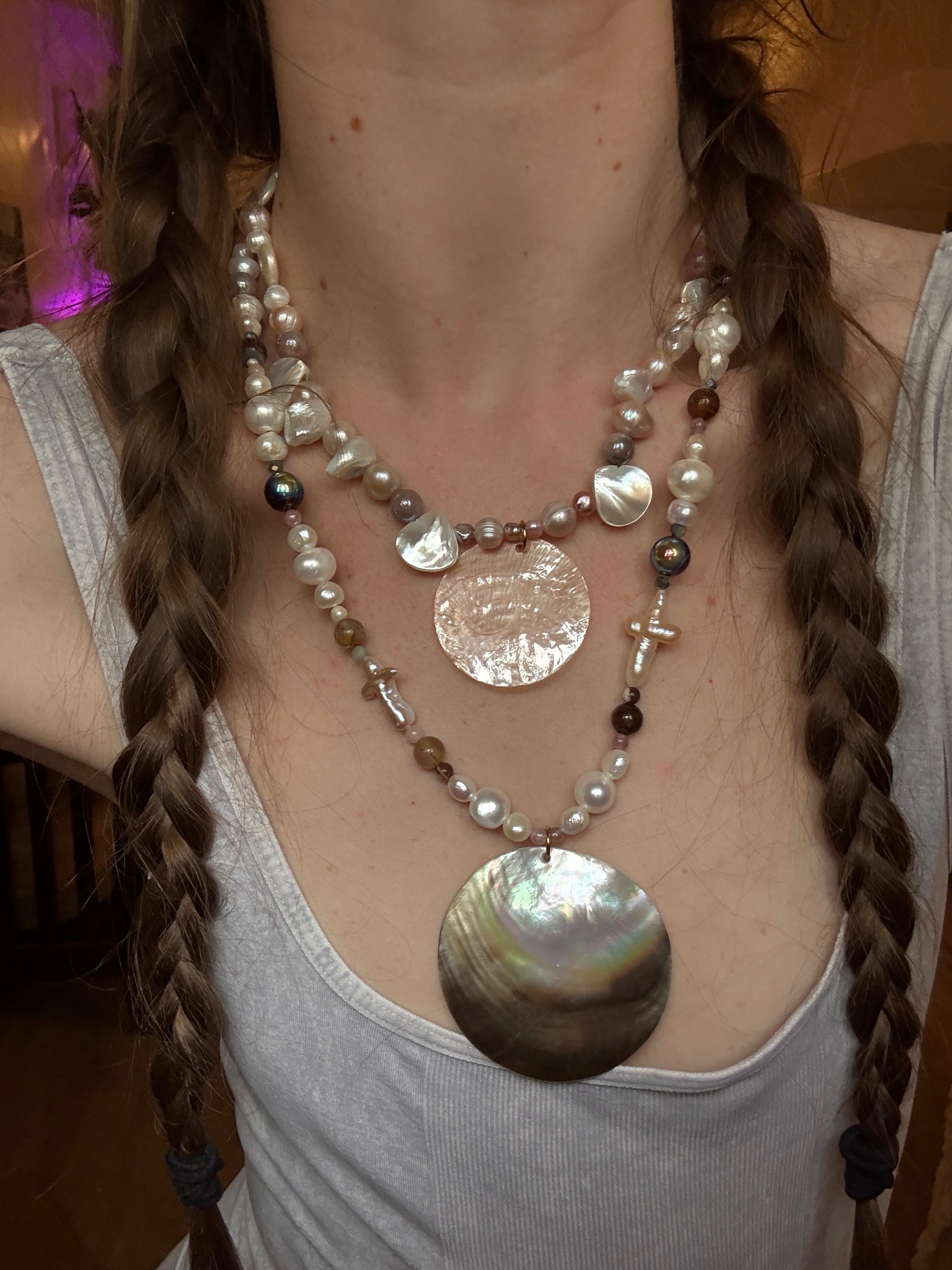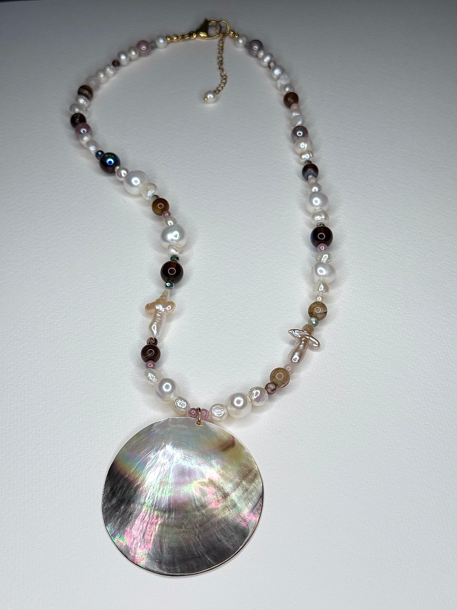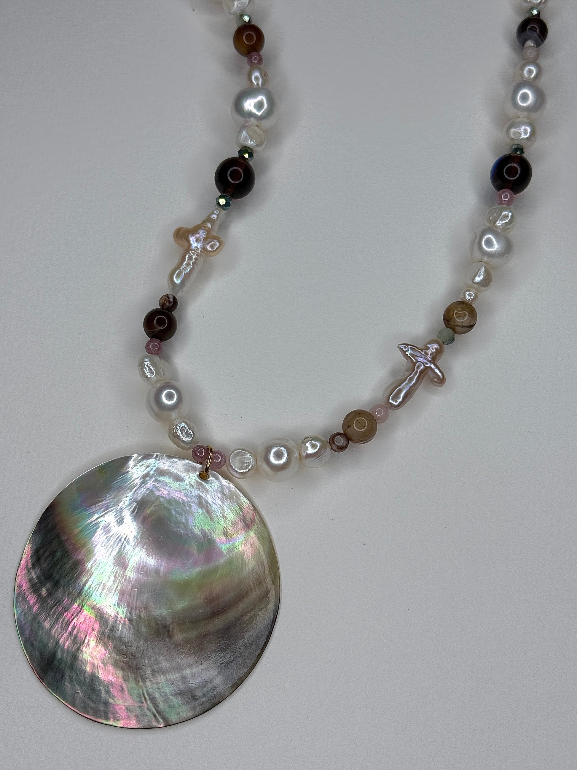 designed with high luster irregular baroque pearls, baroque cross pearls, sunstone, glass beads and large shell pendant