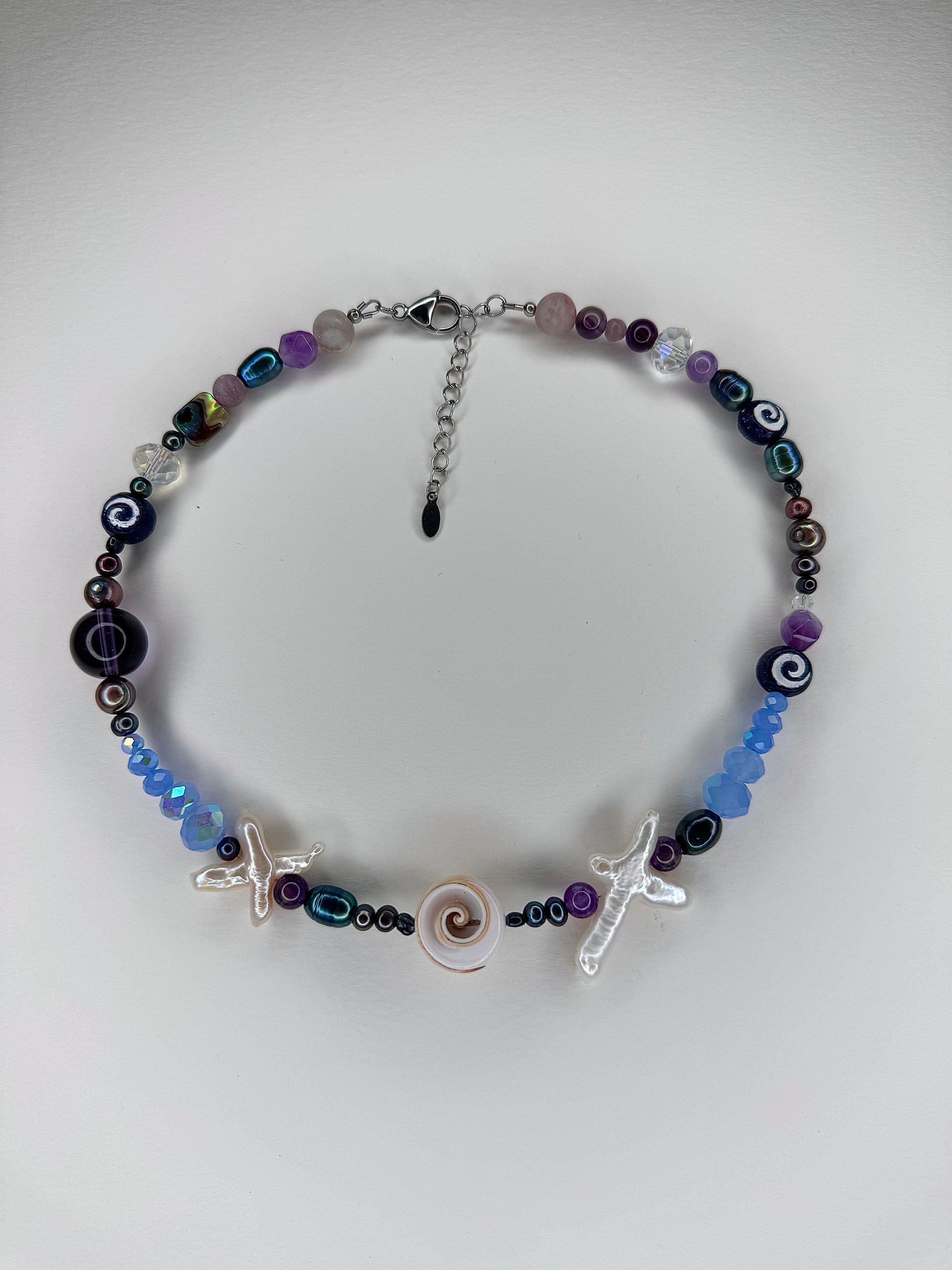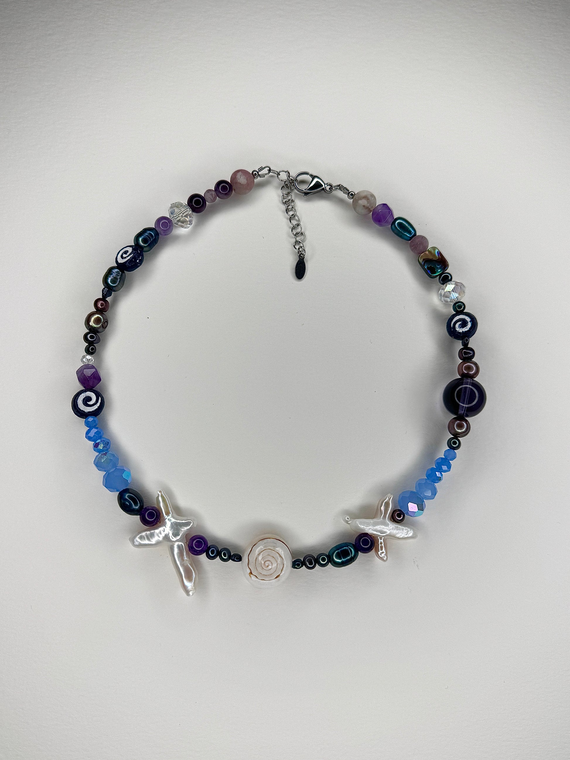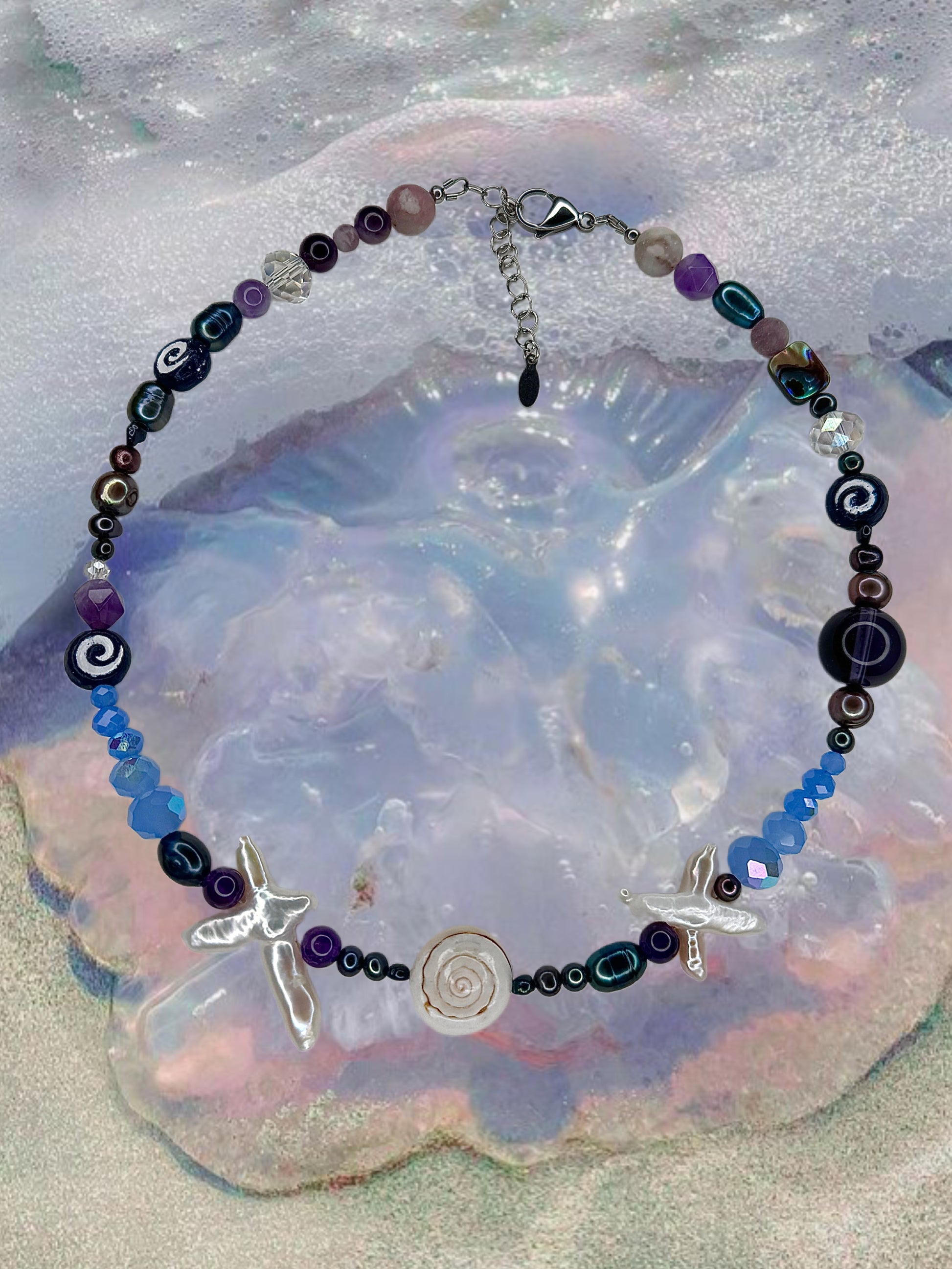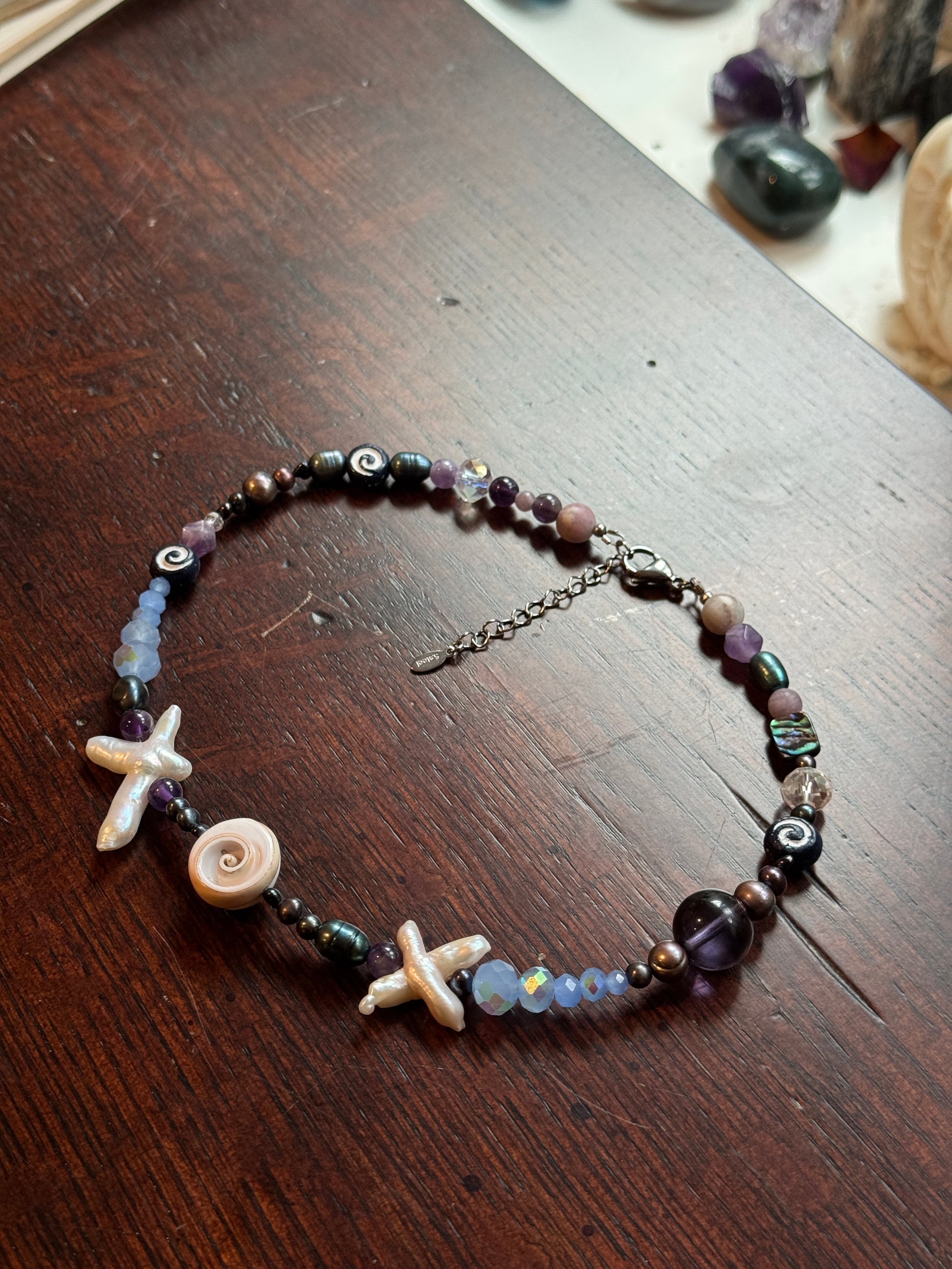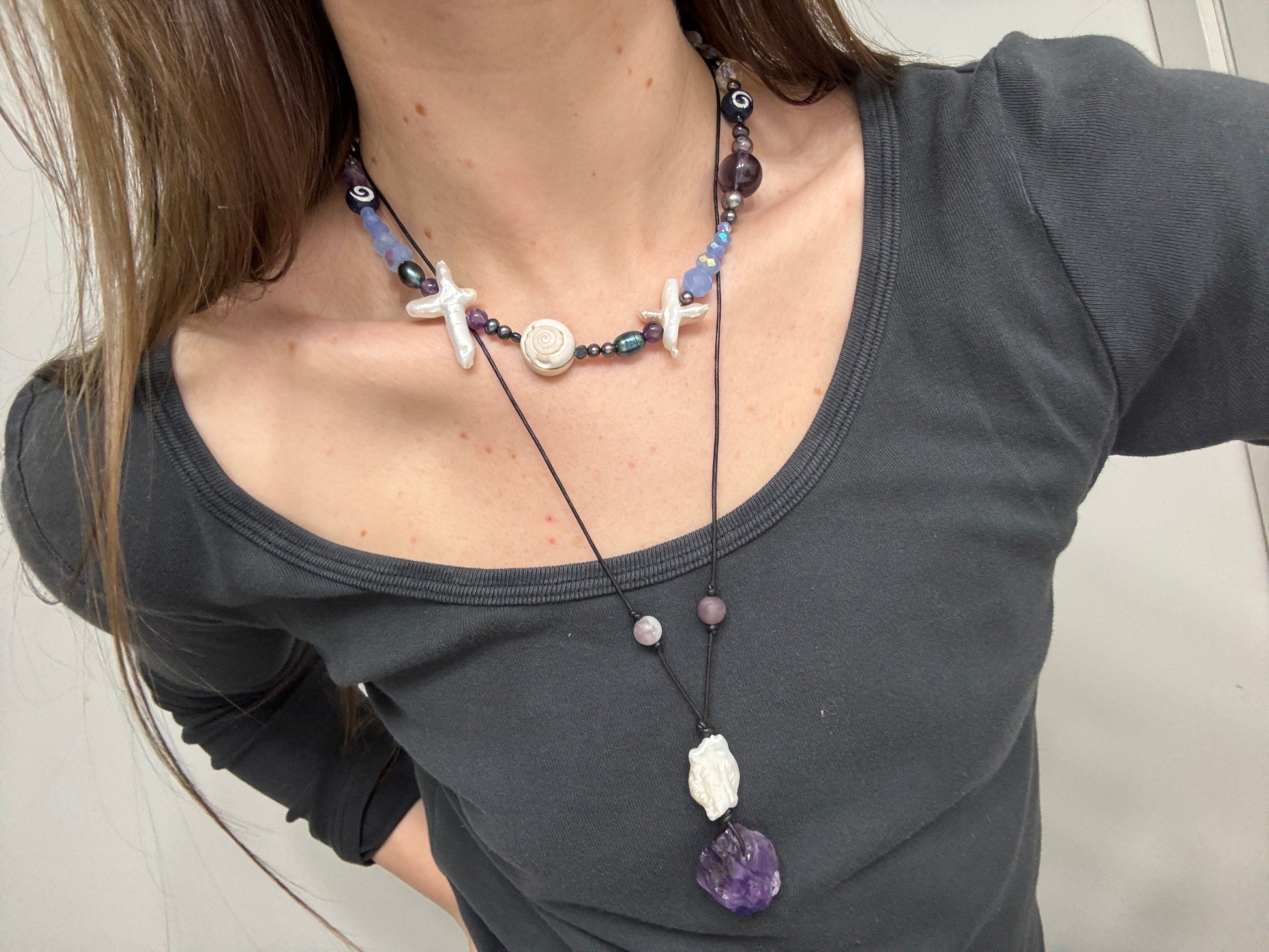 designed with high luster irregular baroque pearls, fireball baroque centerpiece, baroque cross pearl, pink stick pearl, freshwater pearls, shell bead, glass crystal cut beads, glass round beads, sunstone, stainless gold plated chain and hardware.
